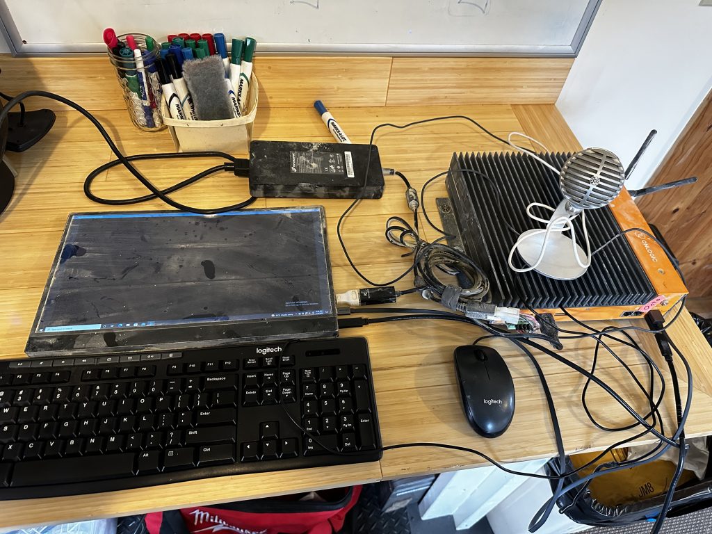 Today I got around to hooking up the awesome OnLogic K800. , the computer that makes Fluffy shine. This computer runs the LED pixel mapping code that translates video files into the signals needed to drive the `14,400 LEDS on Fluffy’s sides. I retrieved the computer when fluffy finally made it back to Vermont a few weeks back, but decided to get it running today in prep for Duane III’s visit. Duane III is making a short ‘making of’ video about fluffy.. and I wanted to show him how the insides of the lighting worked.. It is still covered with a fine fit. of Playa dust.. Brought back many memories.. some of them good !