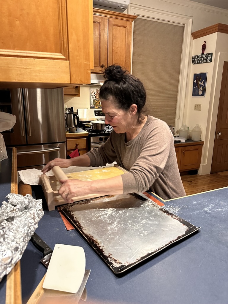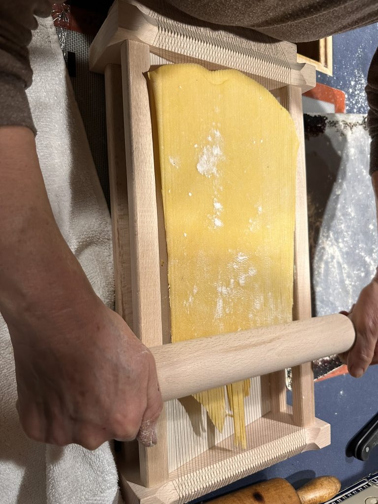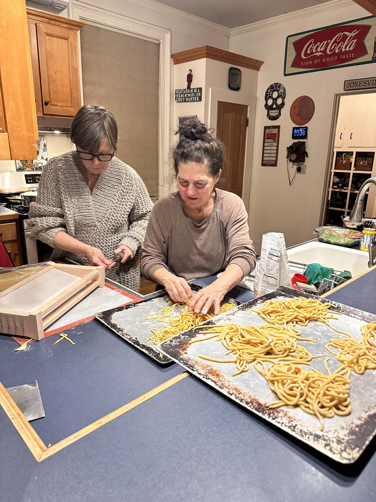 Later in the evening we tried out one of dianes newest toys. I got her a a Pasta “Chitarra” (guitar).. Weed first seen one when we visited Navellie in Abruzzo. It’s a box with a bunch of stretched small wires that is used to cut pasta.… Deb came over and we tried it out. It was really fun fast and very delicious. ‘Diane made pasta with browned onions and fish sauce… Sounds weird, but was so tasty.