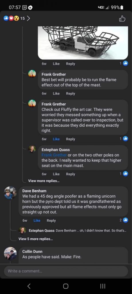 Got a nice surprise today. Friend James found a shoutout to our Fluffy Art car in one of the Mutant Vehicle discussion groups on Facebook. Its midpage in this picture.. . The guy it came from was the Fire lead for one of the most famous burning man art cars: the Mayan Warrior… so It was super nice coming from him.
