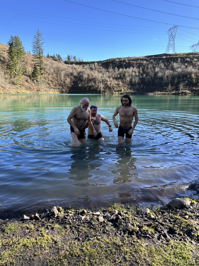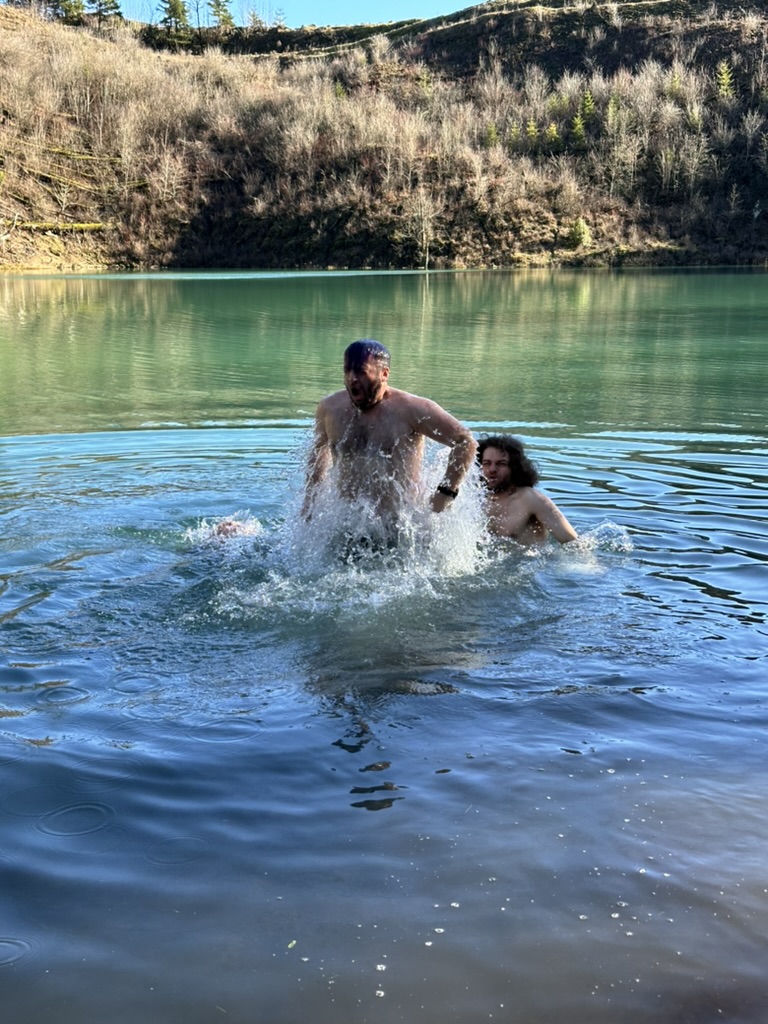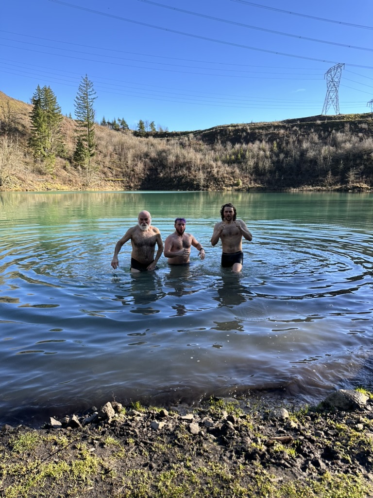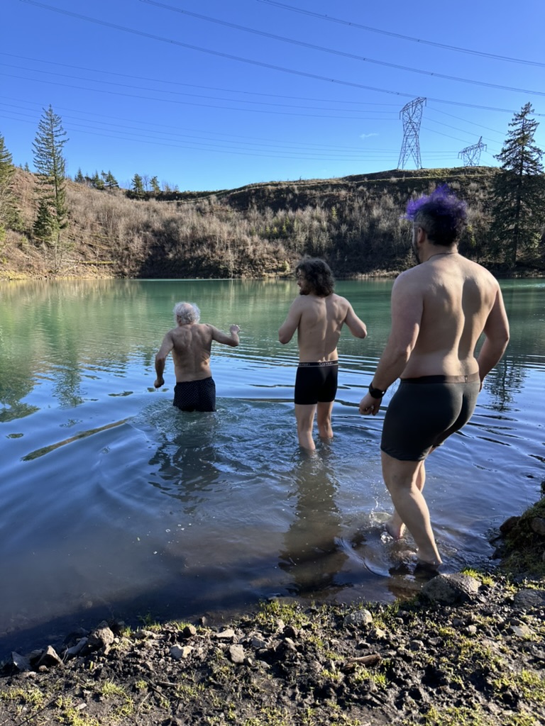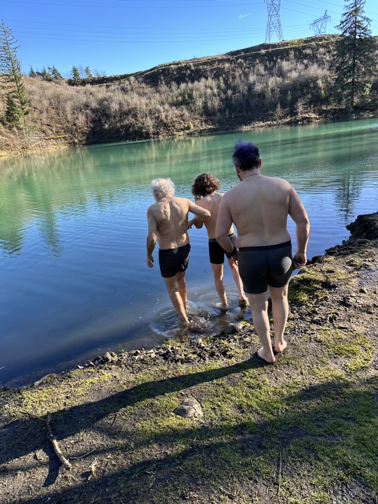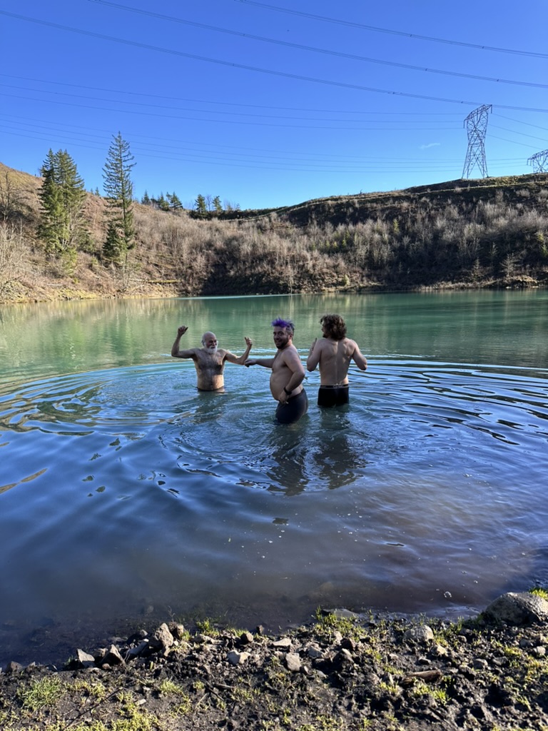 We got up to a small lake.. it was bright blue.. due to soem mineral content.. and really, really cold. That didn’t stop the cohn boyts from taking a dip. It was good timing because our burning man friends had FLuffy at the Penguin Plunge in Burlington. I’m guessing it wasn’t much colder there than here.