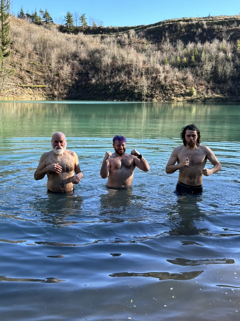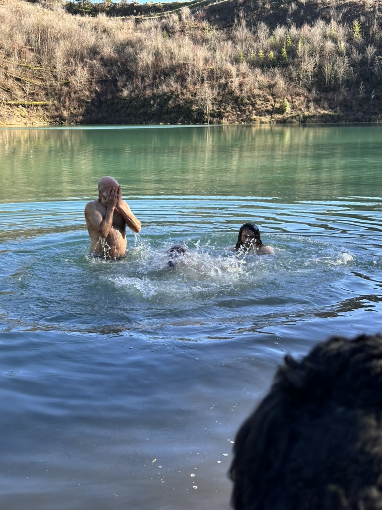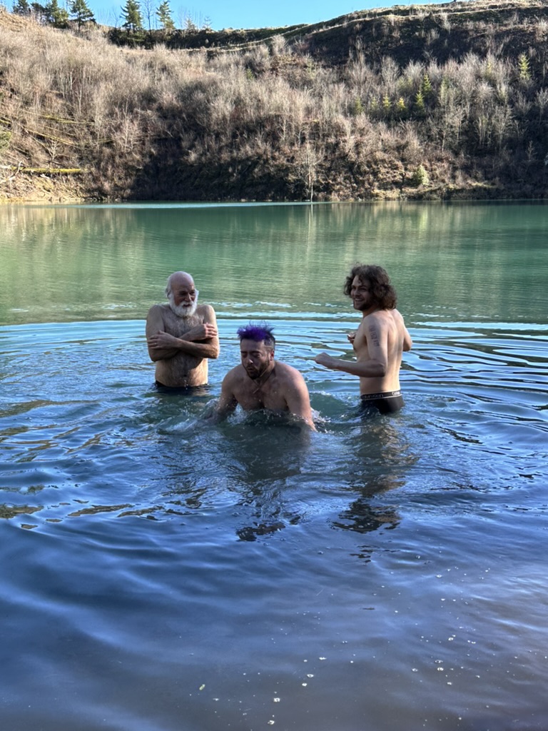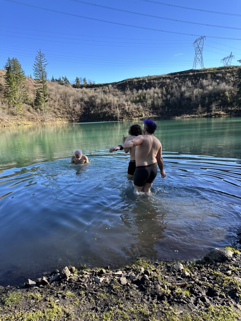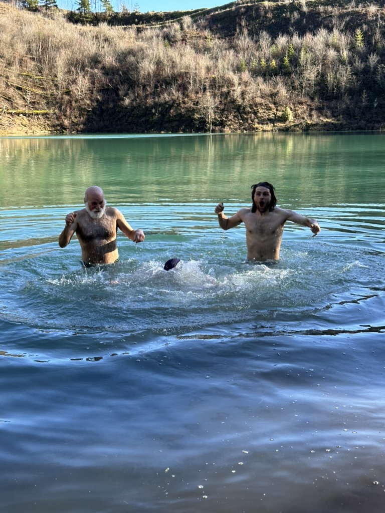 We got up to a small lake.. it was bright blue.. due to soem mineral content.. and really, really cold. That didn’t stop the cohn boyts from taking a dip. It was good timing because our burning man friends had FLuffy at the Penguin Plunge in Burlington. I’m guessing it wasn’t much colder there than here.