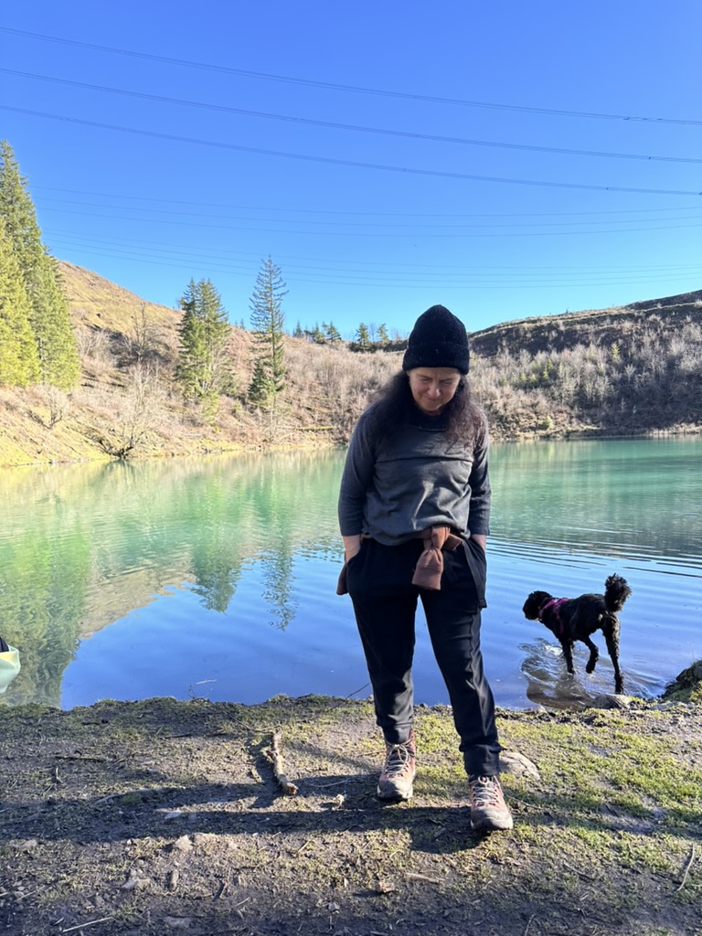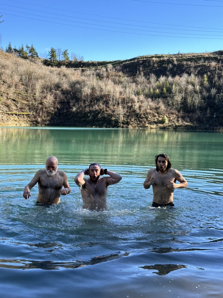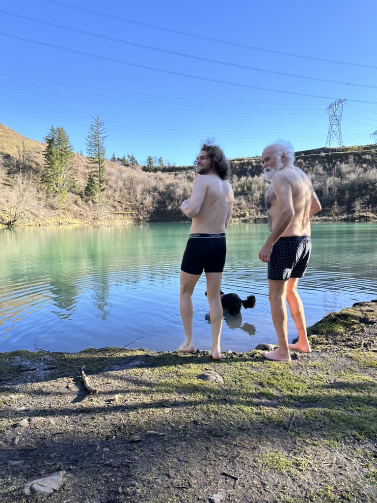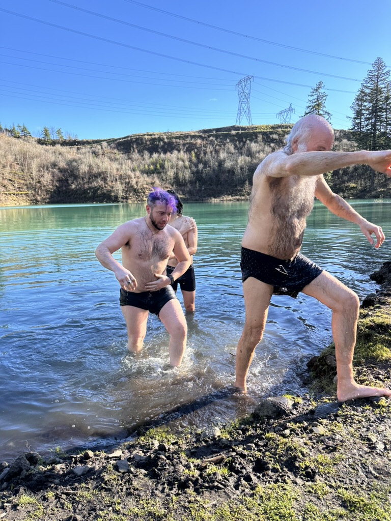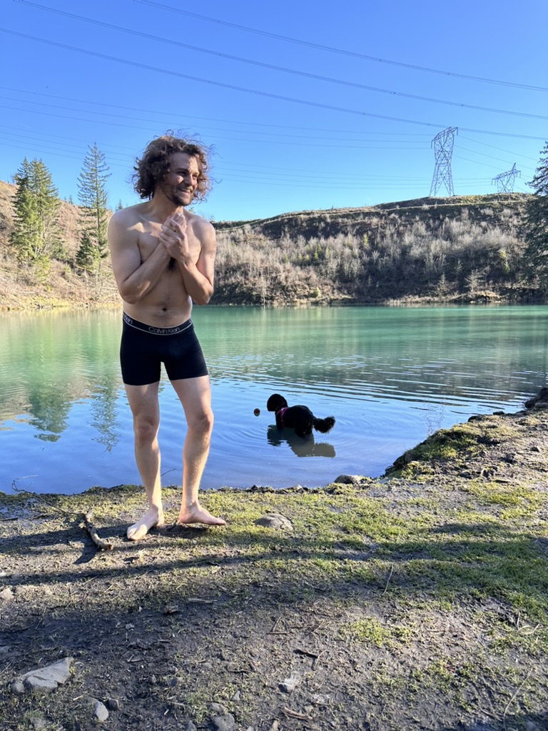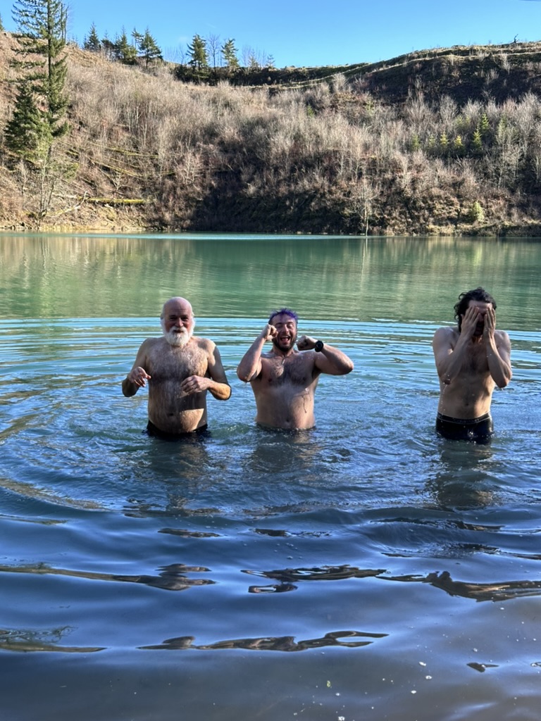 We got up to a small lake.. it was bright blue.. due to soem mineral content.. and really, really cold. That didn’t stop the cohn boyts from taking a dip. It was good timing because our burning man friends had FLuffy at the Penguin Plunge in Burlington. I’m guessing it wasn’t much colder there than here.