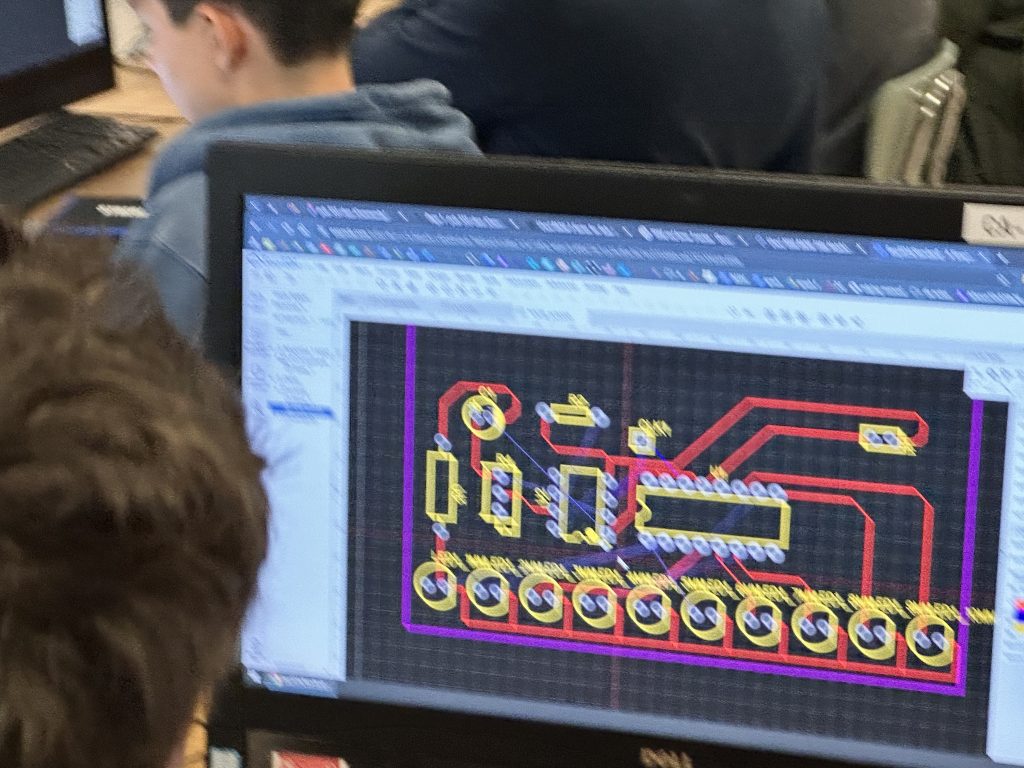 The plan was for each of them to build a custom printed circuit board (PCB) of their circuit.  We had only 1 hour and 40 minutes for both monday and Tuesday. We had alot to cover. Angelina did an excellent job  explaining the process and getting the students started.. After (and during) that .. teh students dove into their own designs. I /we were soooo impressed with these student.s .. .. Angelina and I circulated through the room helping students as needed. Diane helped us keep a watch pourt for anyone who needed more help..    We had a few hic-ups  as any new program does, but by the end of the day.. nearly all of the 32 students were well on their way to their own very cutomized pcb . It was soooooo fun !