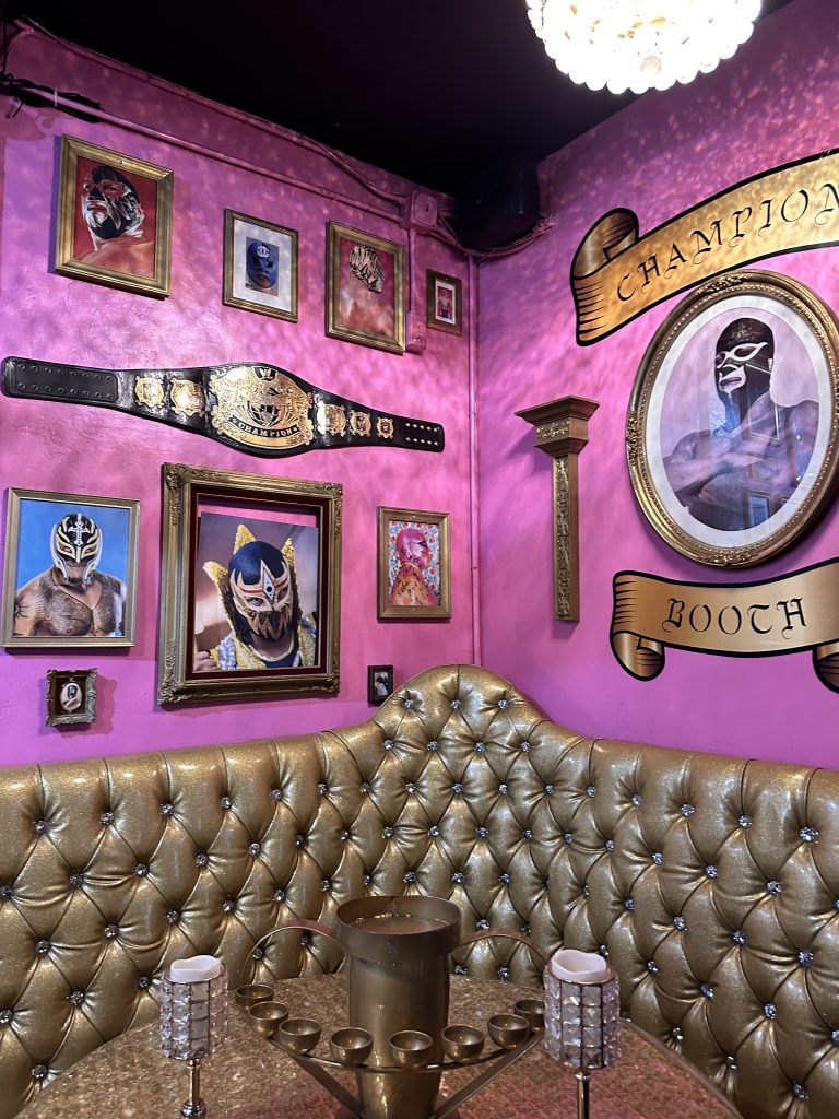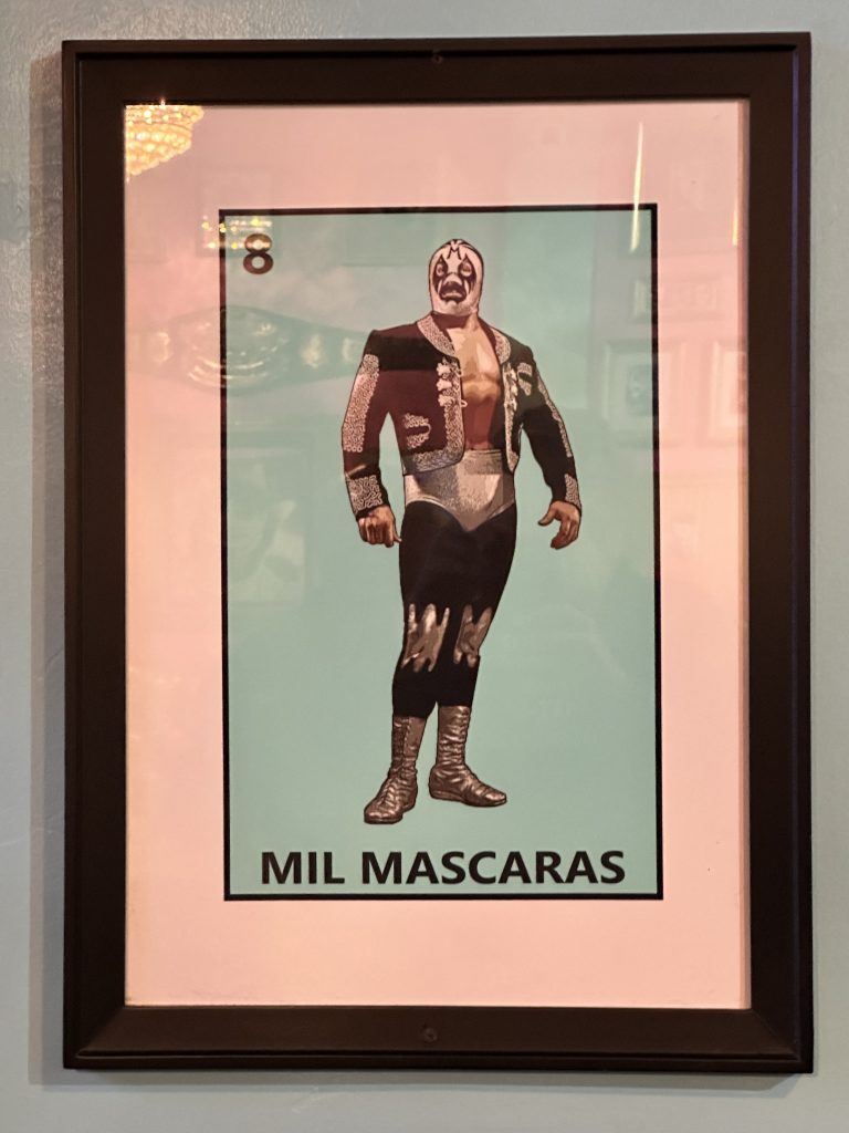 Around 6 we met up with Angelina to geek out on some projects like  the light up prom dress she’s making.. Then ALvin very kindly picked us up and drove us down to thso really great mexican place.. THe theme was “Luchadoros” .. the masked wrestlers I used to watch in Houston.. I was telling  them about my favoret Luchadore..”Mil Mascaras” the man with a thousand masks…” .. and there was a picture of him in the bar..