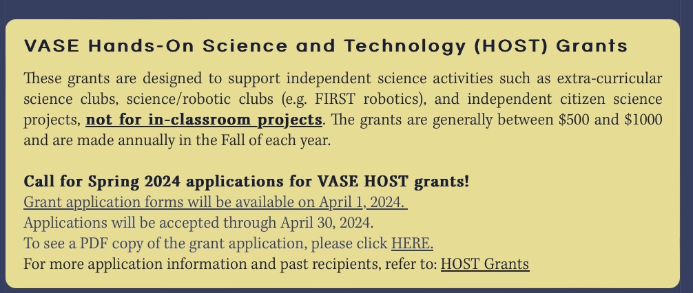 Are you .. or someone you know .. a classroom teacher who needs a a grant to buy equipment for hands on science and technology learning ? If so, check out the VASE Small Equipment Grants (SEG) .. SEG grants can be forf up to $1500 . The grant application is due by end of dat on April 30th. The application is here