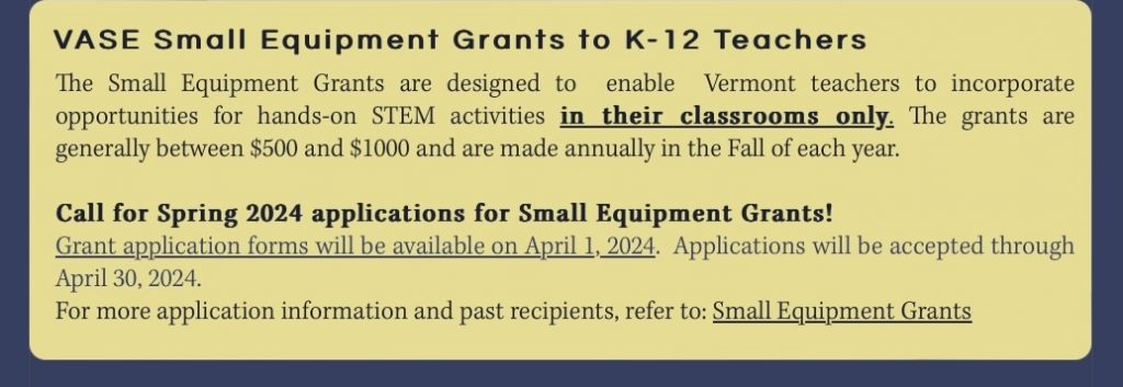 I am a member of a group called the Vermont Academy of Science and Technology (VASE).. Vase has a mission to help spread love and understanding of science and technology across the Green Mountain State. One of the ways we do that is through our grants programs. We’re in the middle of this springs grant offering period. You can read about the grants here