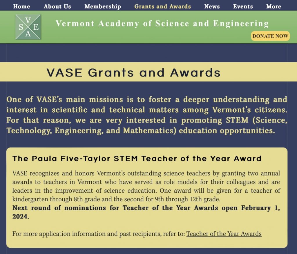 Do you know a Vermont Science and/or Technology Teacher that deserves recognition which includes a $1000 award and an invitation to speak at the VASE Annual Meeting. Check out the VASE Paula Fives Taylor Teacher of the Year Grants here . The nomination is due by end of dat on April 30th.