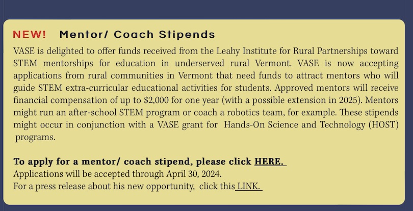 Finally.. if you or someone you know is a coach or mentor to an extracurricular science or technology activity like a science club or FIRST Robotics you may be eligible for up to $2000 as a coach/mentor stipend. These grants are available thanks to the generosity of the Leahy Center on Rural Partnerships. (Note due to the rural focus these grants are not available in Chittenden county) .The grant application is due by end of dat on April 30th. To learn more please check out the application here.