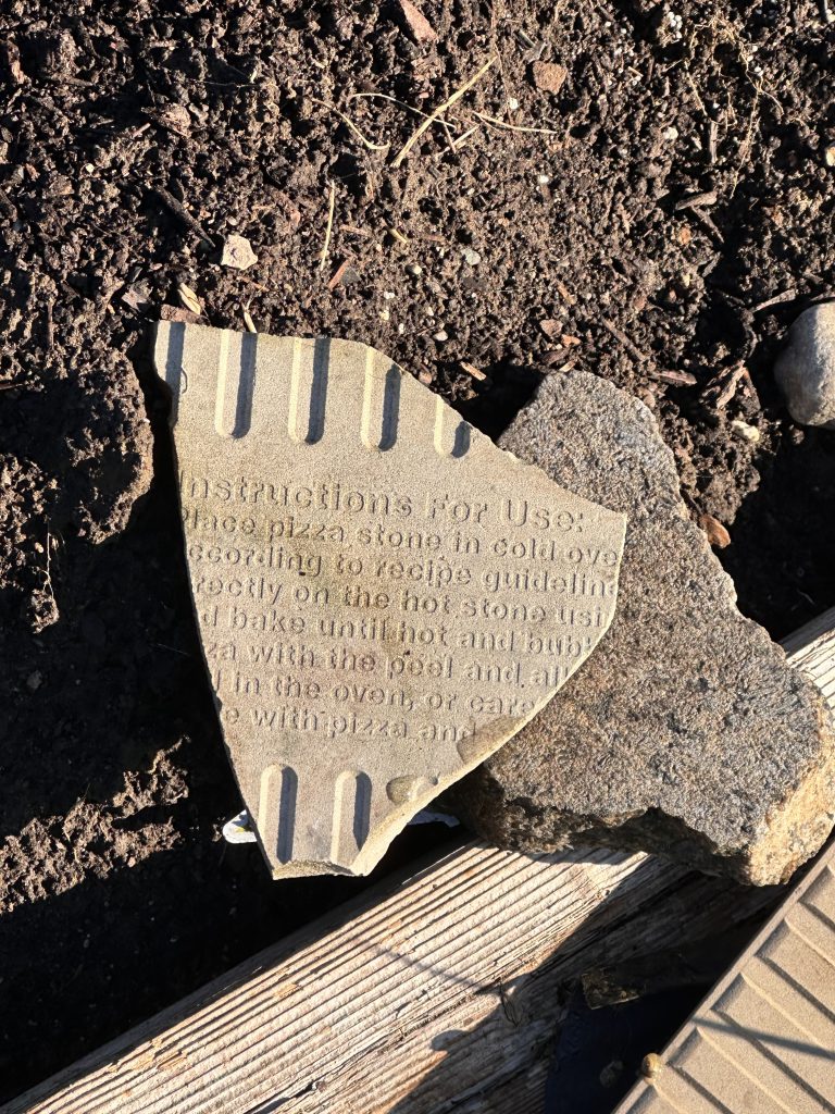We found this piece of stone / ceramic in the garden.. must have come from the old pizza oveen that max and diane had made.. it was cool digging up such an artifact