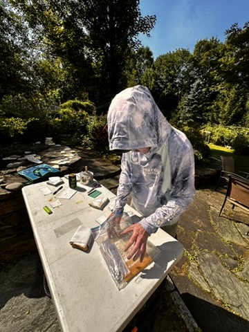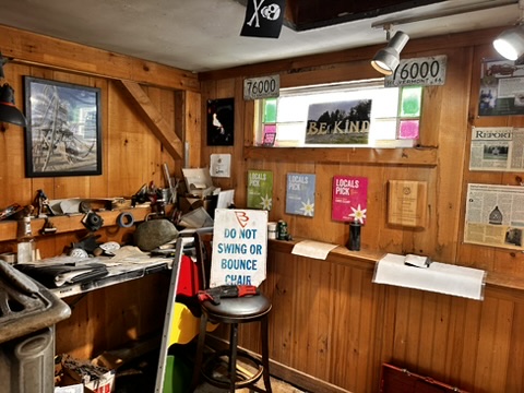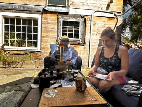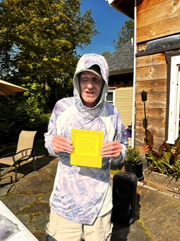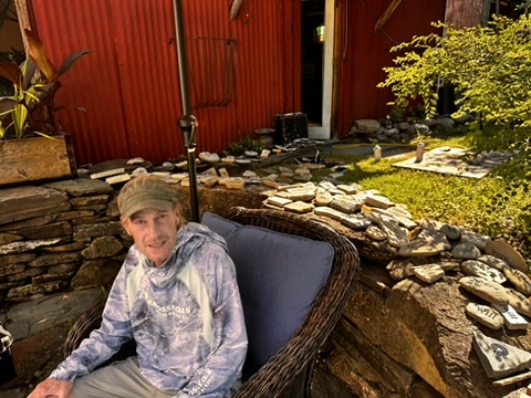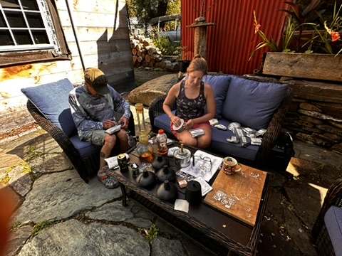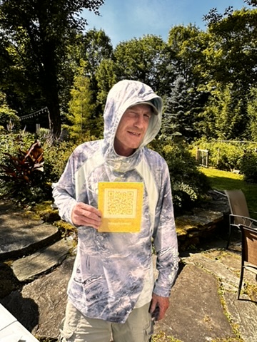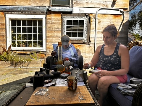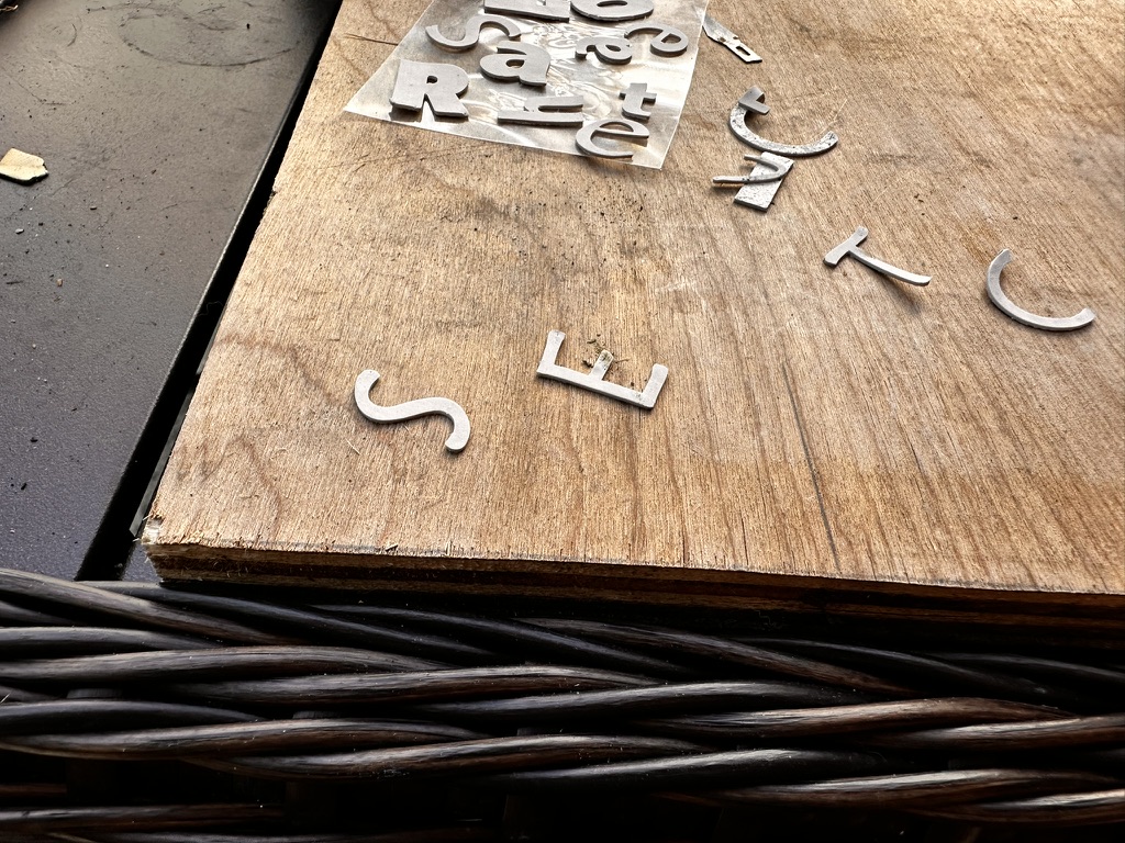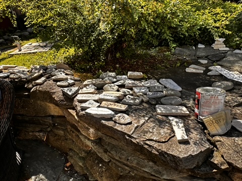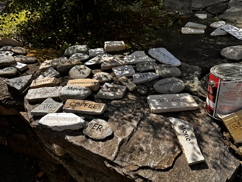 Dropped by CHris’s house on the way in to work,. I’ve had this QR code that Max made to help Chris raise money for his HOPE project . Chris and Kim were workign on a new word garden and were surrounded wiht letters and sandblased stone.I love visitign Chris and Kim.. there’s always so much cool art happening around them.. .