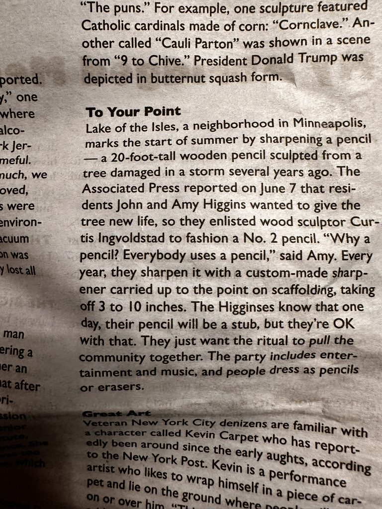 One other fun thing today.. We get a fun monthly magazine called funny times.. today one of the feathered ‘news of the weird” pieces was about my sister Mary’s friends’ giant pencil in their front yard.. >> I think I have a picture of it somewhere
