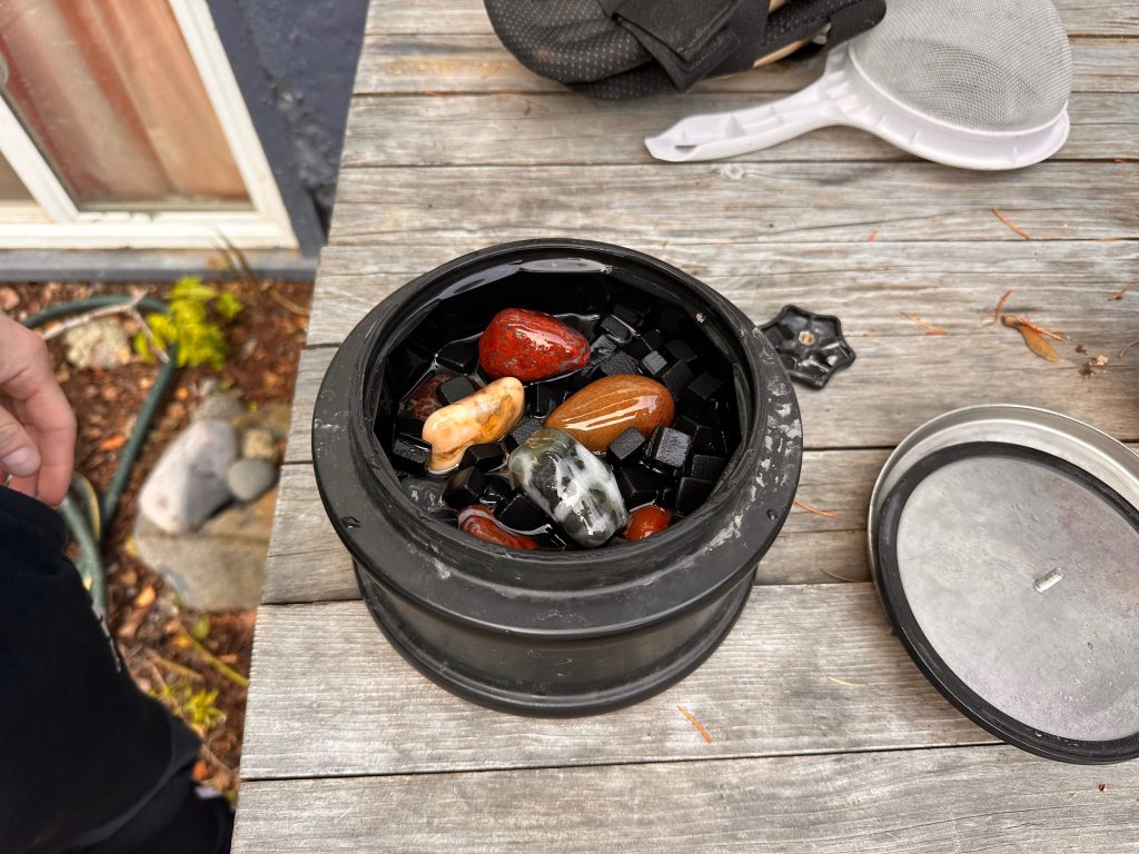lots more of the same today.. tons of boxes, sorting a zillion things.. only picture from teh day was Gabe emptying his rock tumbler.. cant beelive Ididnt take more pictures !