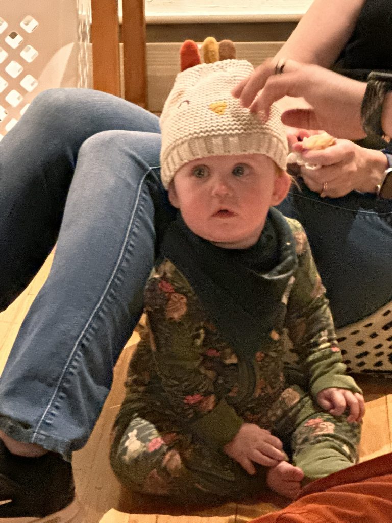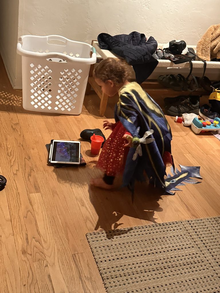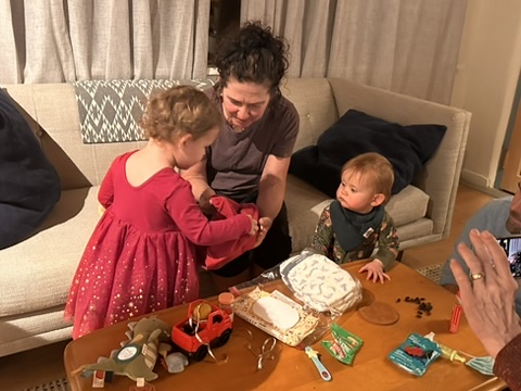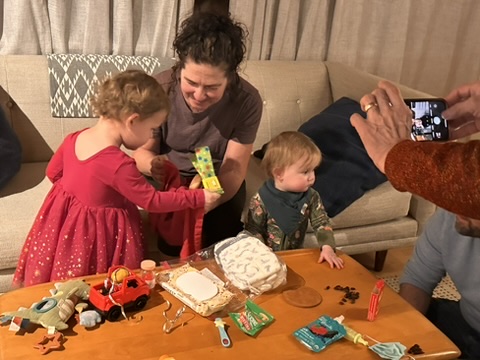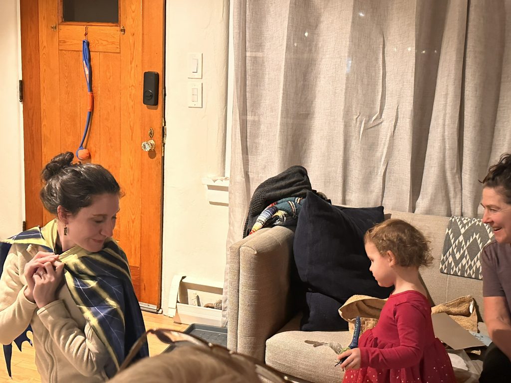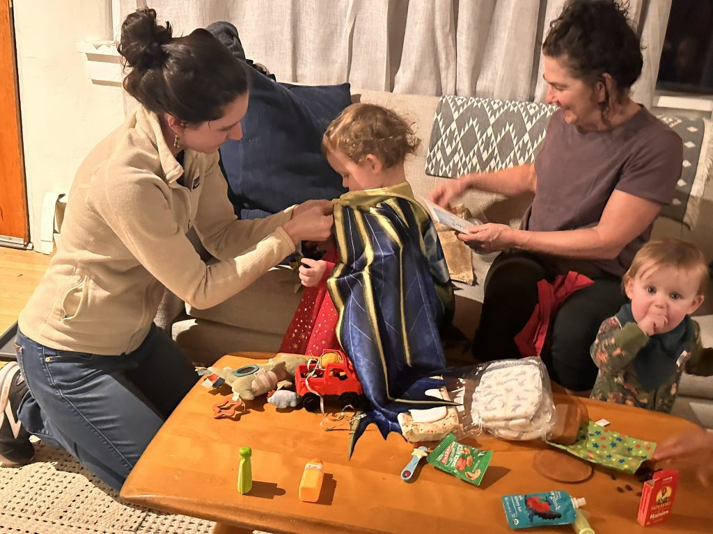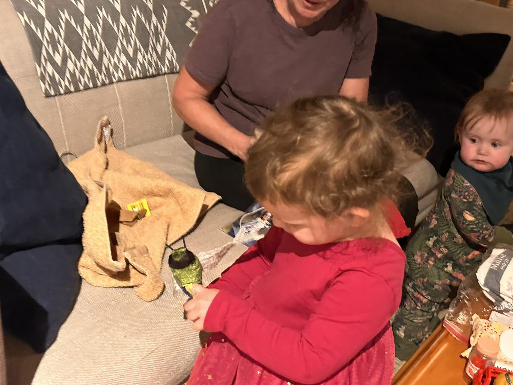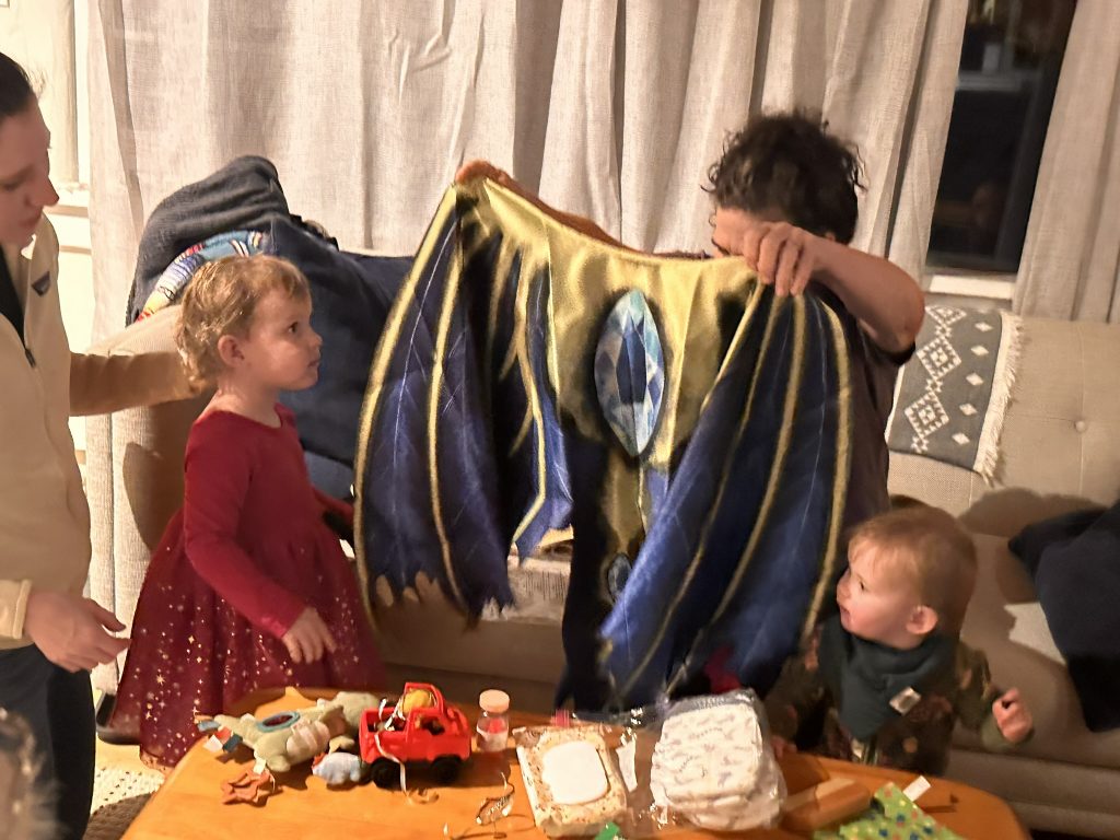 After dinner, diane gave the girls some little presents shed found in portland. there was a dragon fly finger puppet and a dragon fly cape for Vivian and a really cool crinkly noise make for jules..