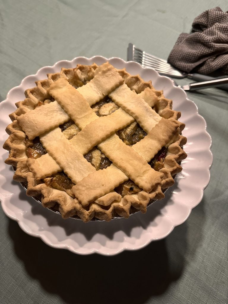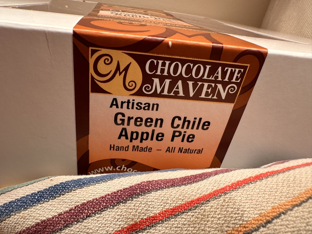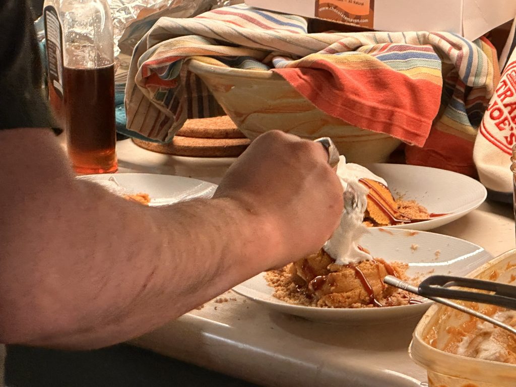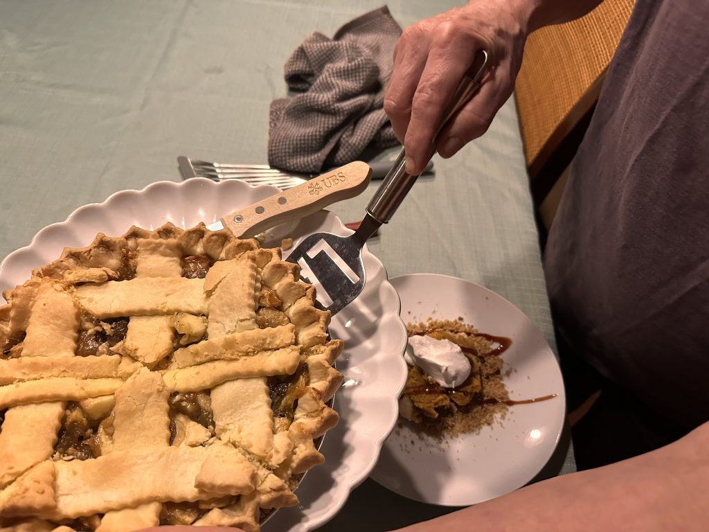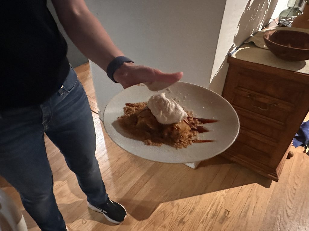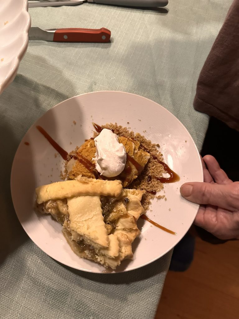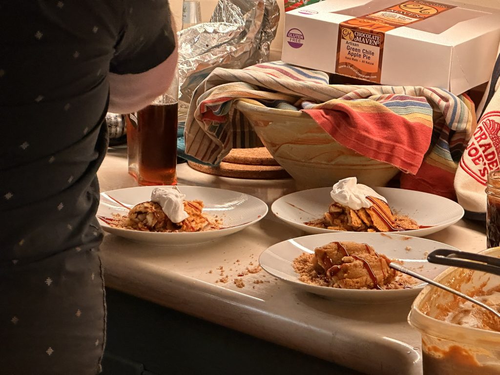 then for dessert max had spent last night perfecting a non dairy pumpkin ice cream with non dairy whipped cream served on a bed of crumbs made from soem frozen vermont apple cider donuts that max had brought back on is last trip to vermont That was paired with the gluten free green chile apple pie that Diane,. Max and Ihad picked up yesterday from Choclate Maven