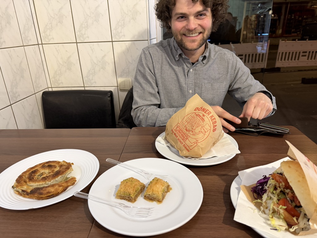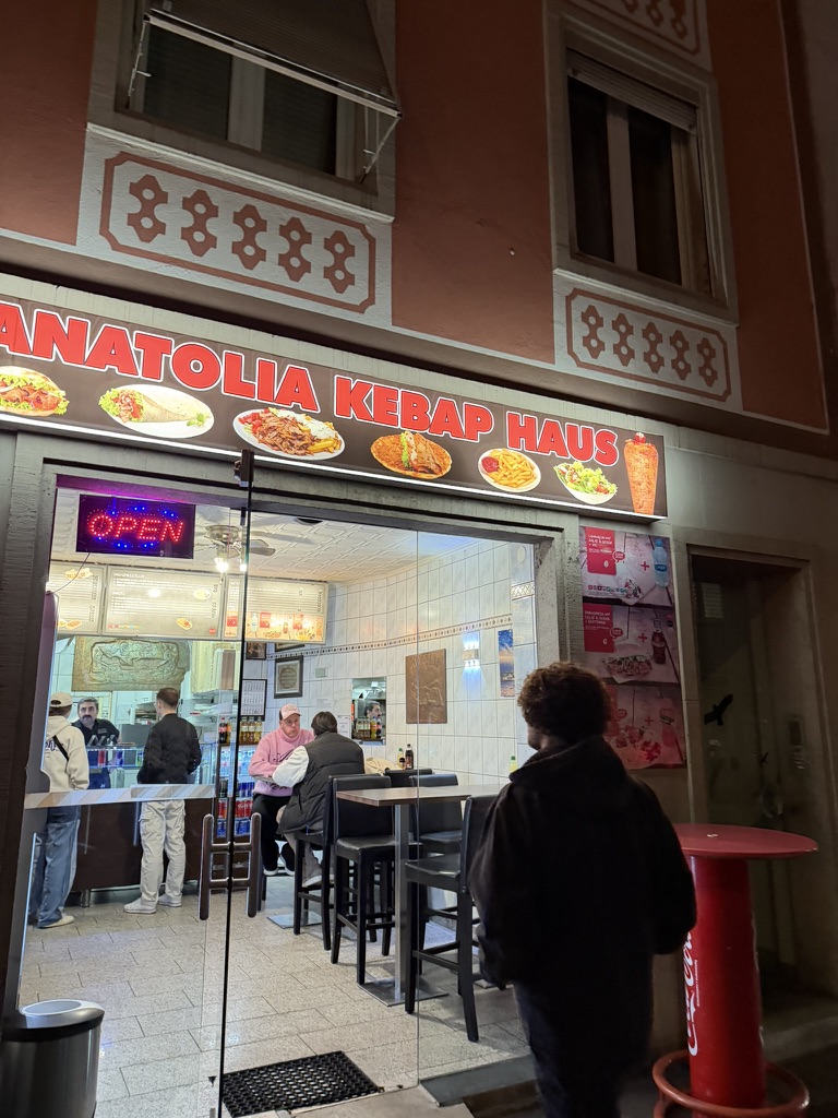 Tonight we decided we’d treat ourselves to the first Doner.. Doner shops are all over Germany.. they specialize in Drehspieß. .. (literally turning food) .. or rotisserie.. it’s very much like Gyros .. They also have falafel and other middleeastern goodies. We found one with good reviews and walked down there