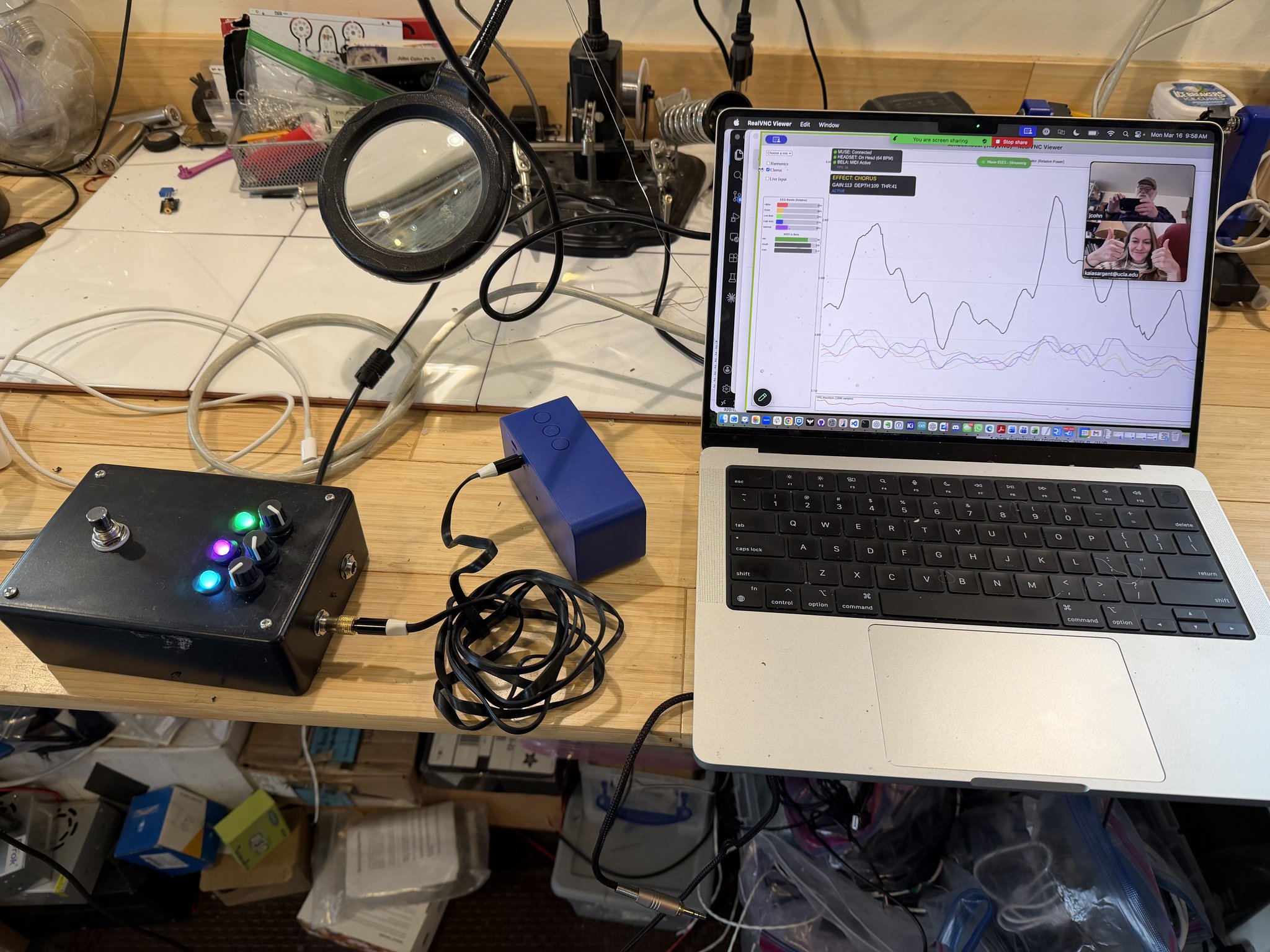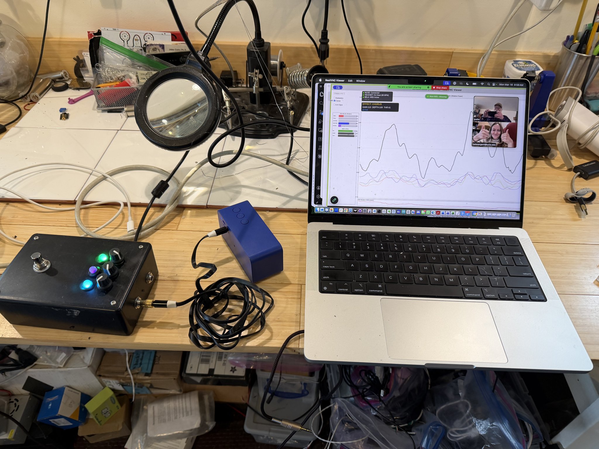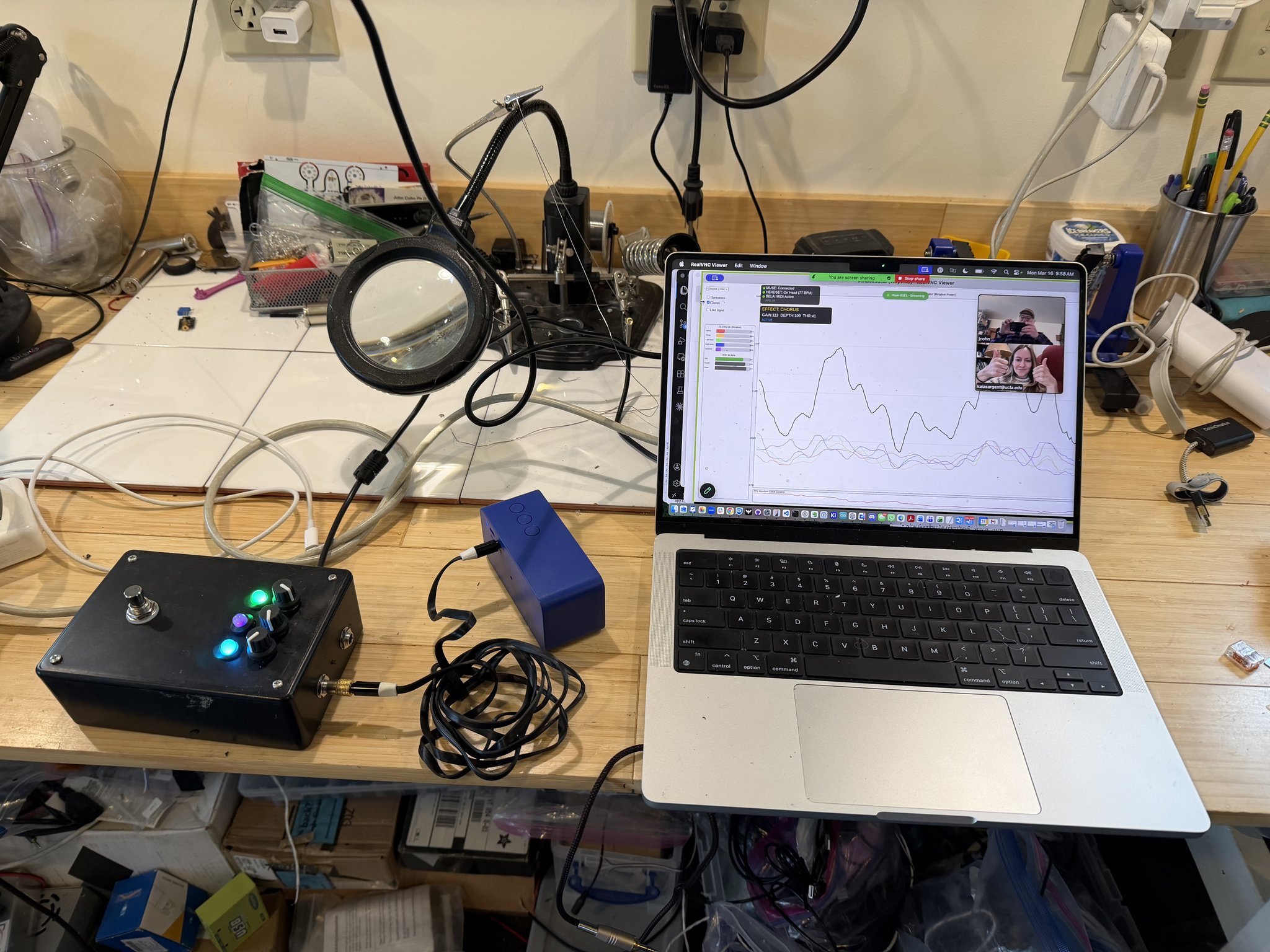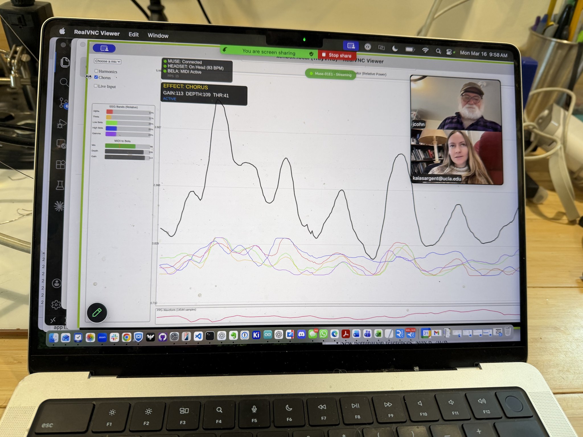 I know I havent talked much abotu this.. but soem freinds of mine (mike, suz, greg, kaia, nick , and esteben) have been working on a project to convert human brain waves into music. More specifically we are trying to detect the “flow state” and use that to modulate a musicians instrument.… It’s been going on for a long time…. Early points of us all being out working with Mike and Bob Weir (see http://johncohn.org/base/2023/04/16/sunday-night-the-project/)