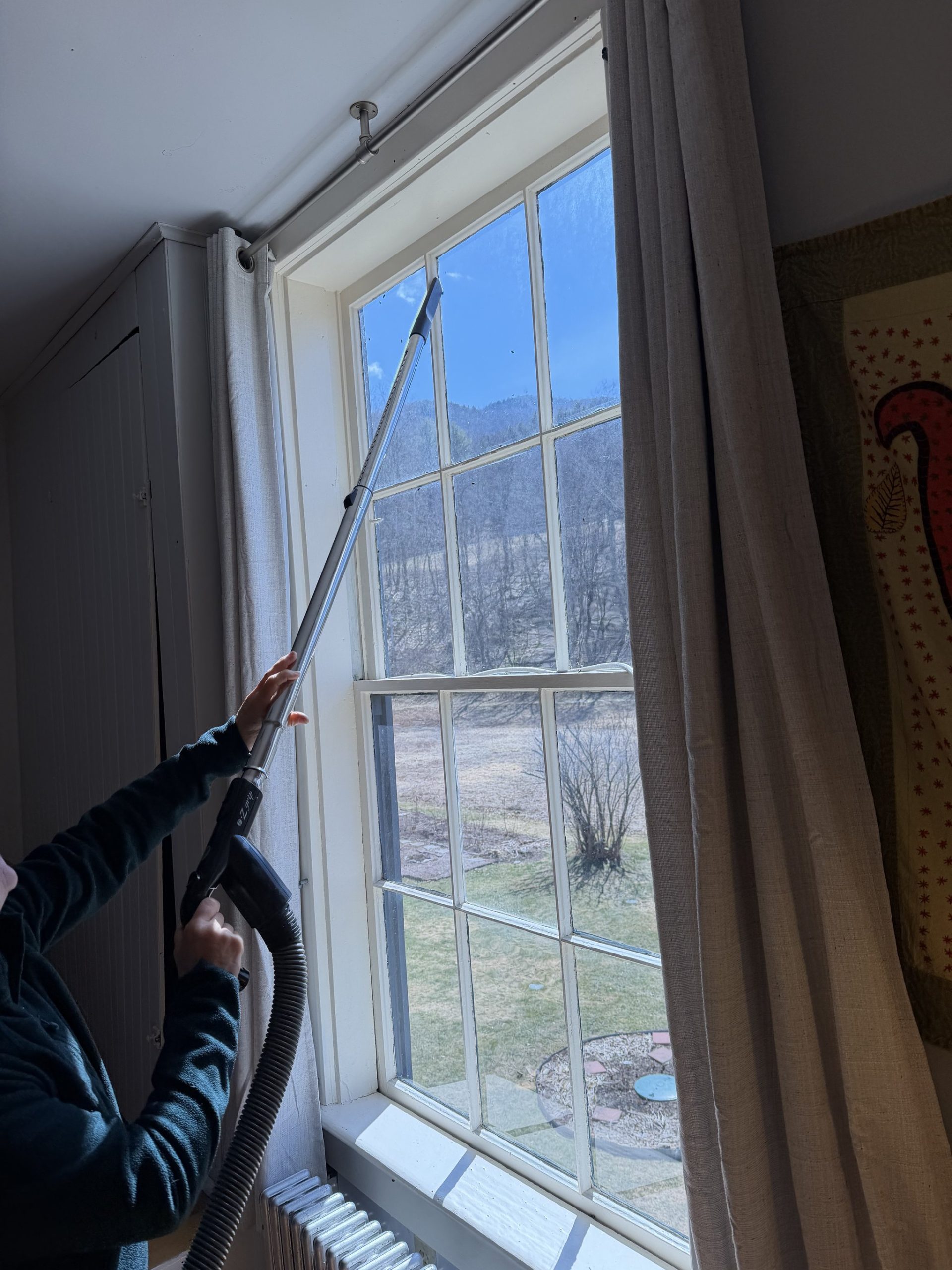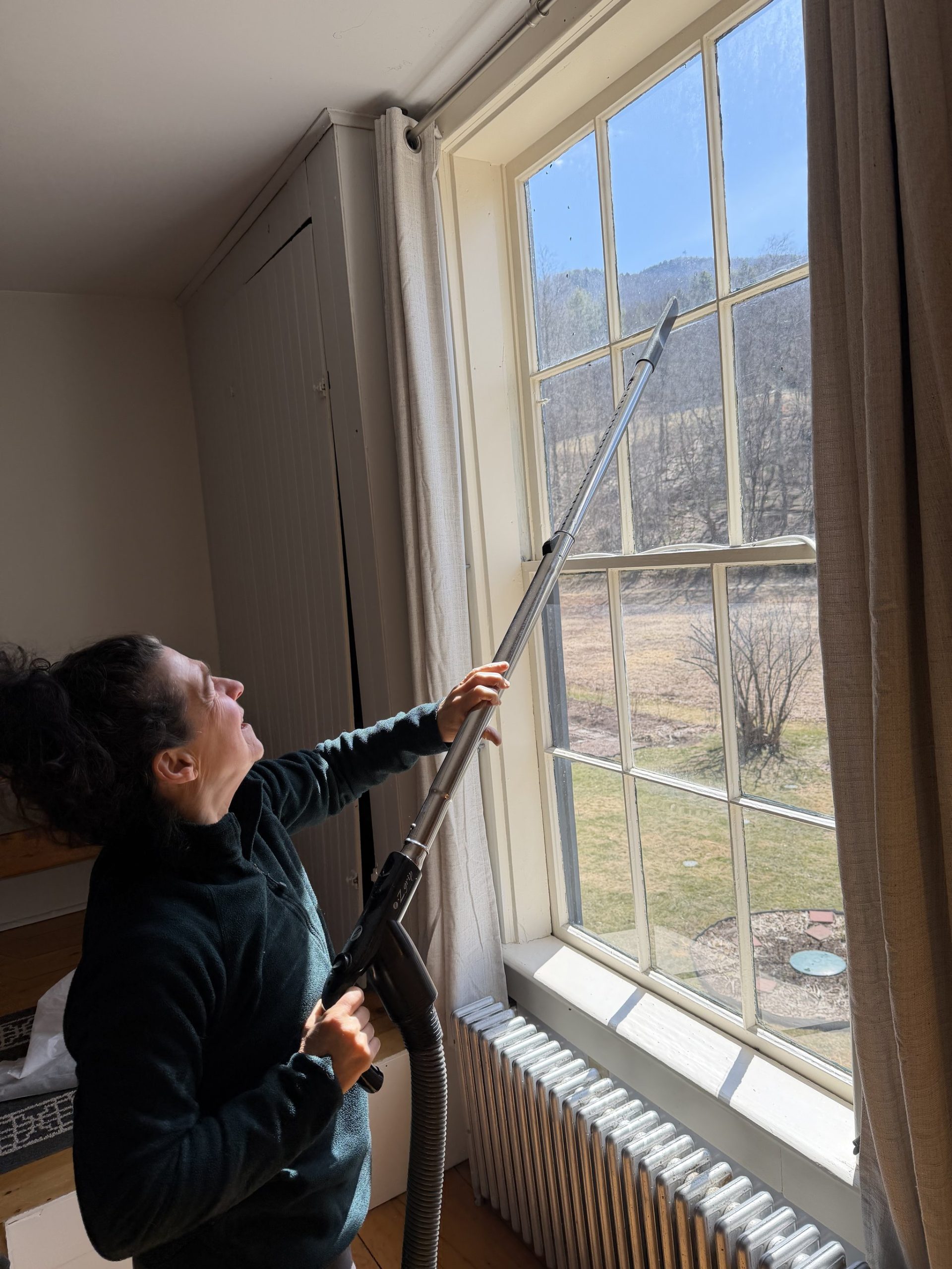 .. and even though its still getting cold,  it’s time to take the interior storm windows down… Not so much because its gettign warm (it I. we have soem 60 degree days now !)  but because we can stand looking at all the dead lady Beatles. (they look like ladybugs) they’re trapped under the storm with us. Always fun, moving huge panes of glass.