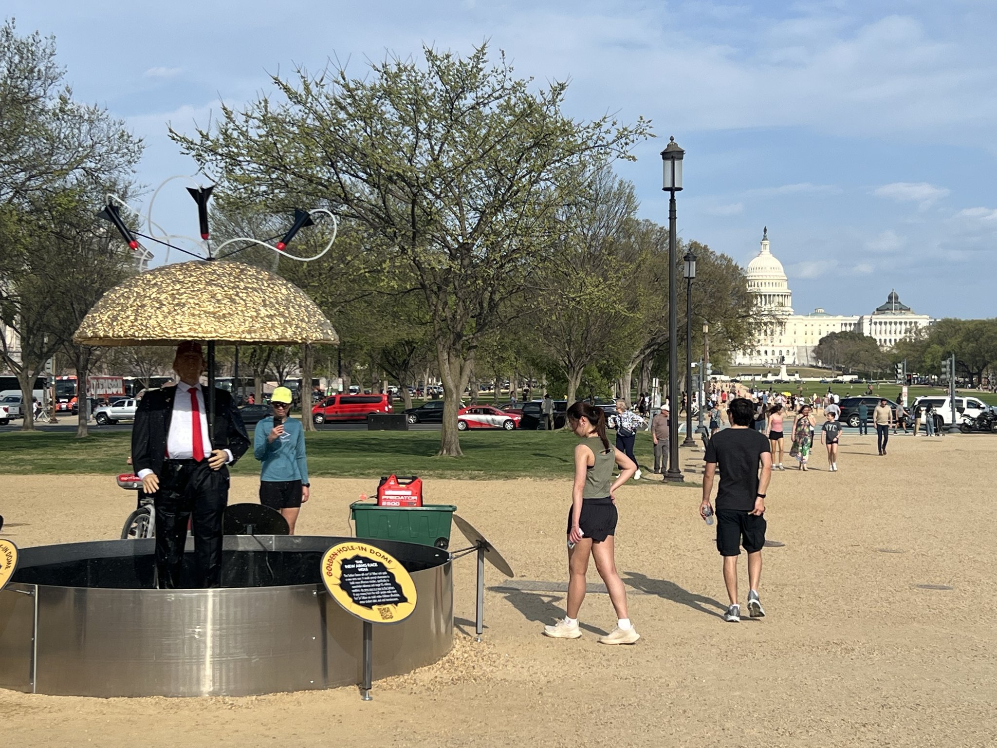 We got pictures today from Ben, gizzo and rebar… They’ve been working on this project called the golden shower… It ppokes fun at the golden dome project that you know who is trying to get funded for $4 trillion. The basic idea is its Mr T stating in a kitty pool holding a golden dome that float holes as missiles come in and squirt water on getting him all wet. Ben has a permit to have this piece of art in front of the White House for three days. Gizzo and rebar been working on it furiously for the last couple of weeks and it really came out well.… There was a lot of news coverage about this. It’s a serious story saying that spending that much money on a solution that really won’t make the world safer when we could be spending some of that money for education, healthcare, and all the other things this country needs.