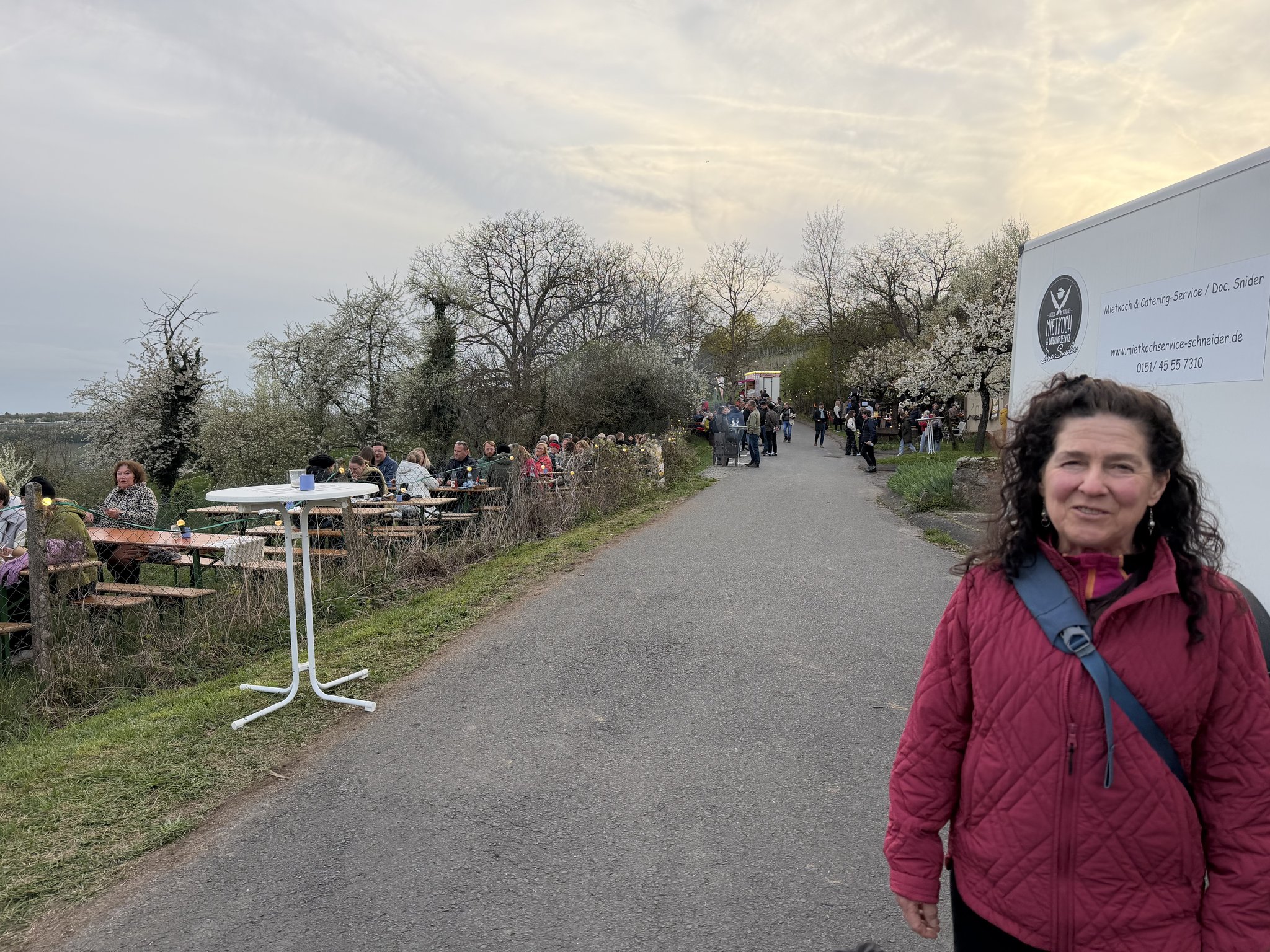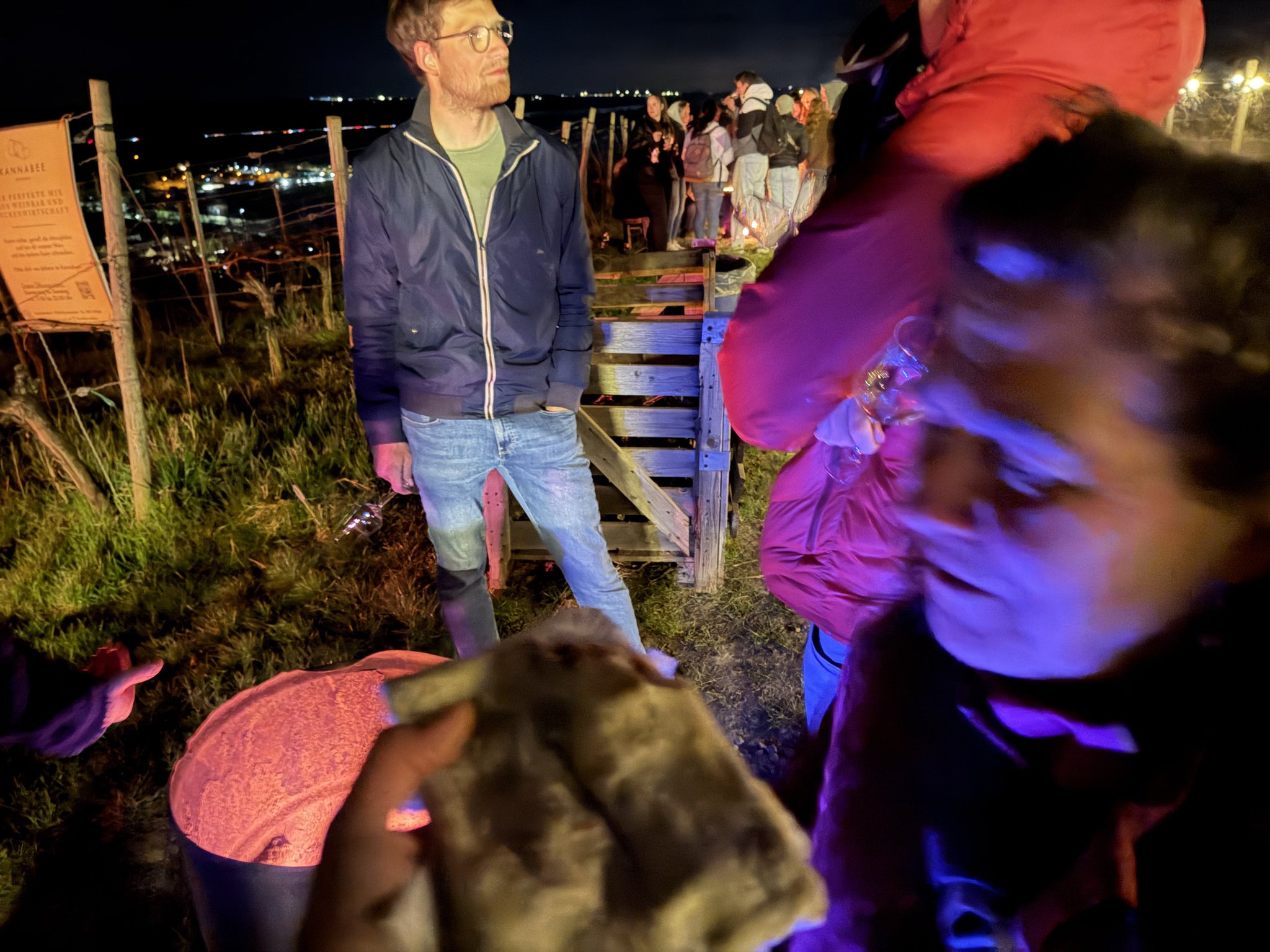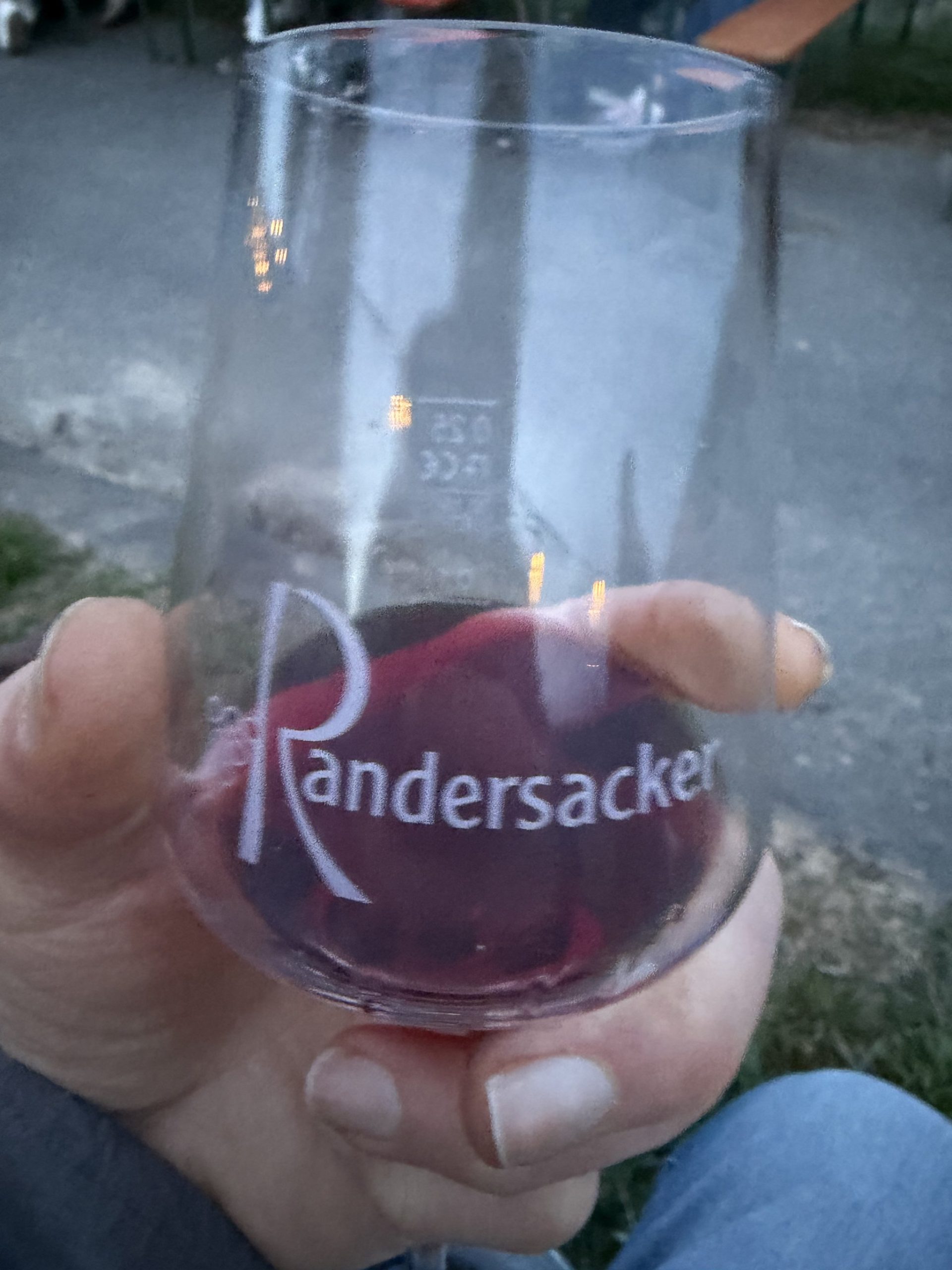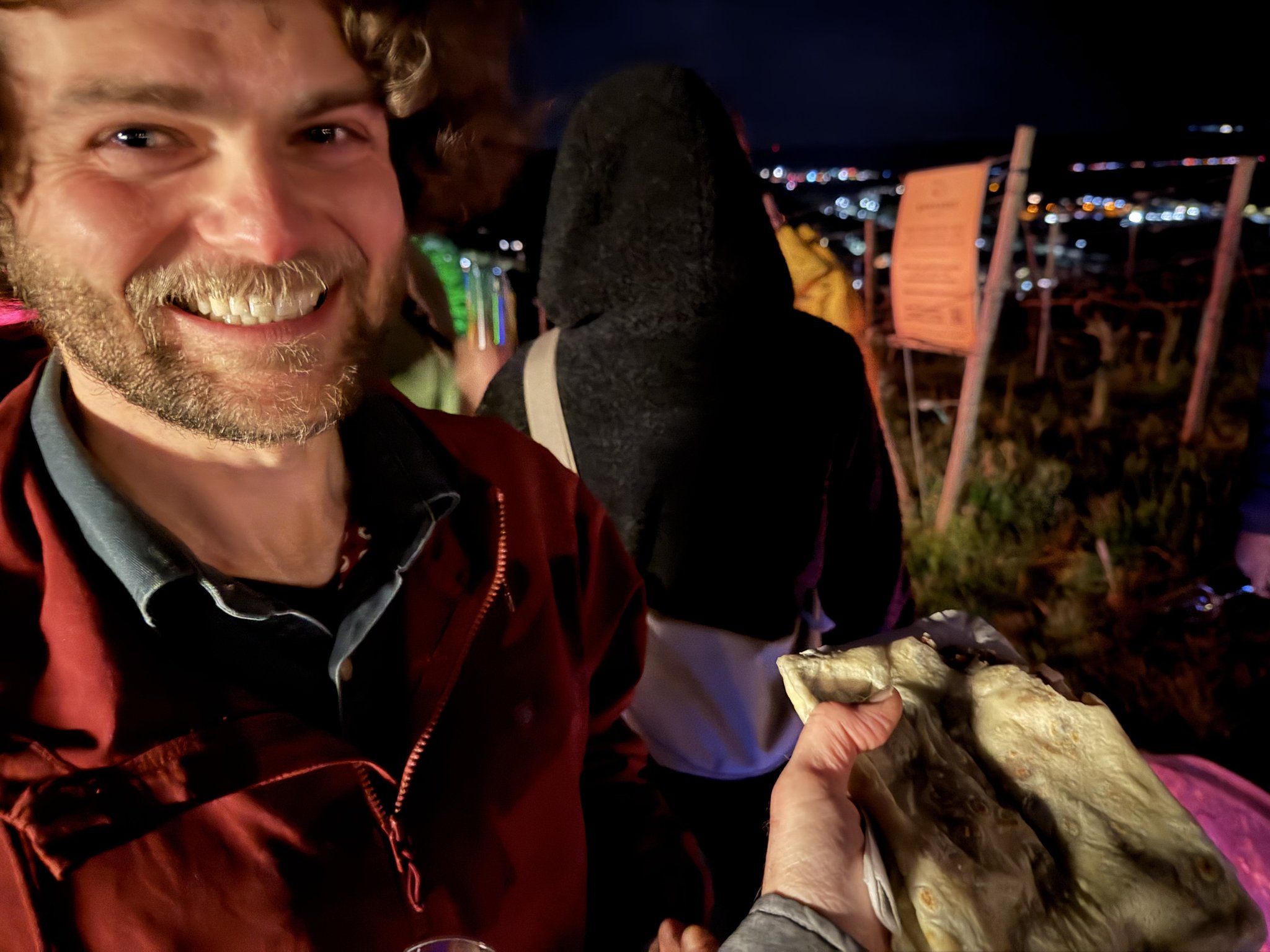 THis evening we hiked over to teh vinyard above Randersaker for the wine festical. .It was quite a scene.. Lots (mabey 100 ? ) of people there drinkign local wine from this year, eating various parts of animals.. and making flamekuchne (kind of a local type of Pizza).. there were fire barrells everywhere that kept us all warm.. then hiked back in the dark.. so very fun !!!
