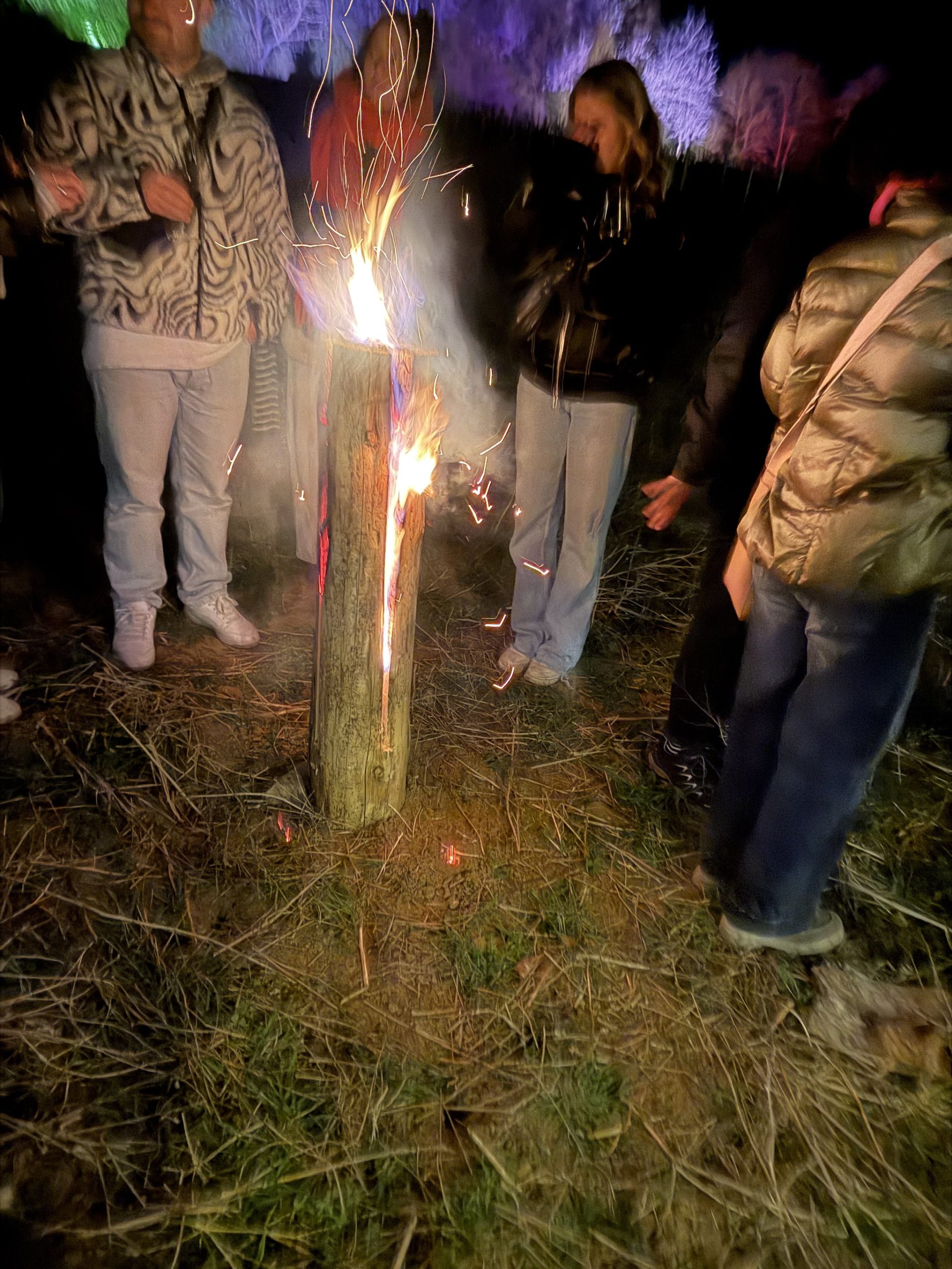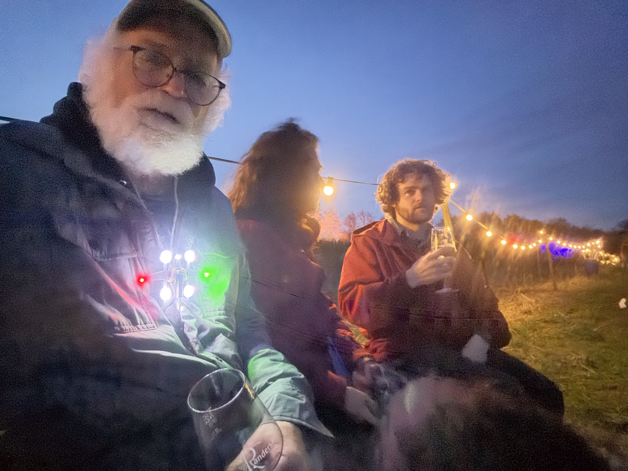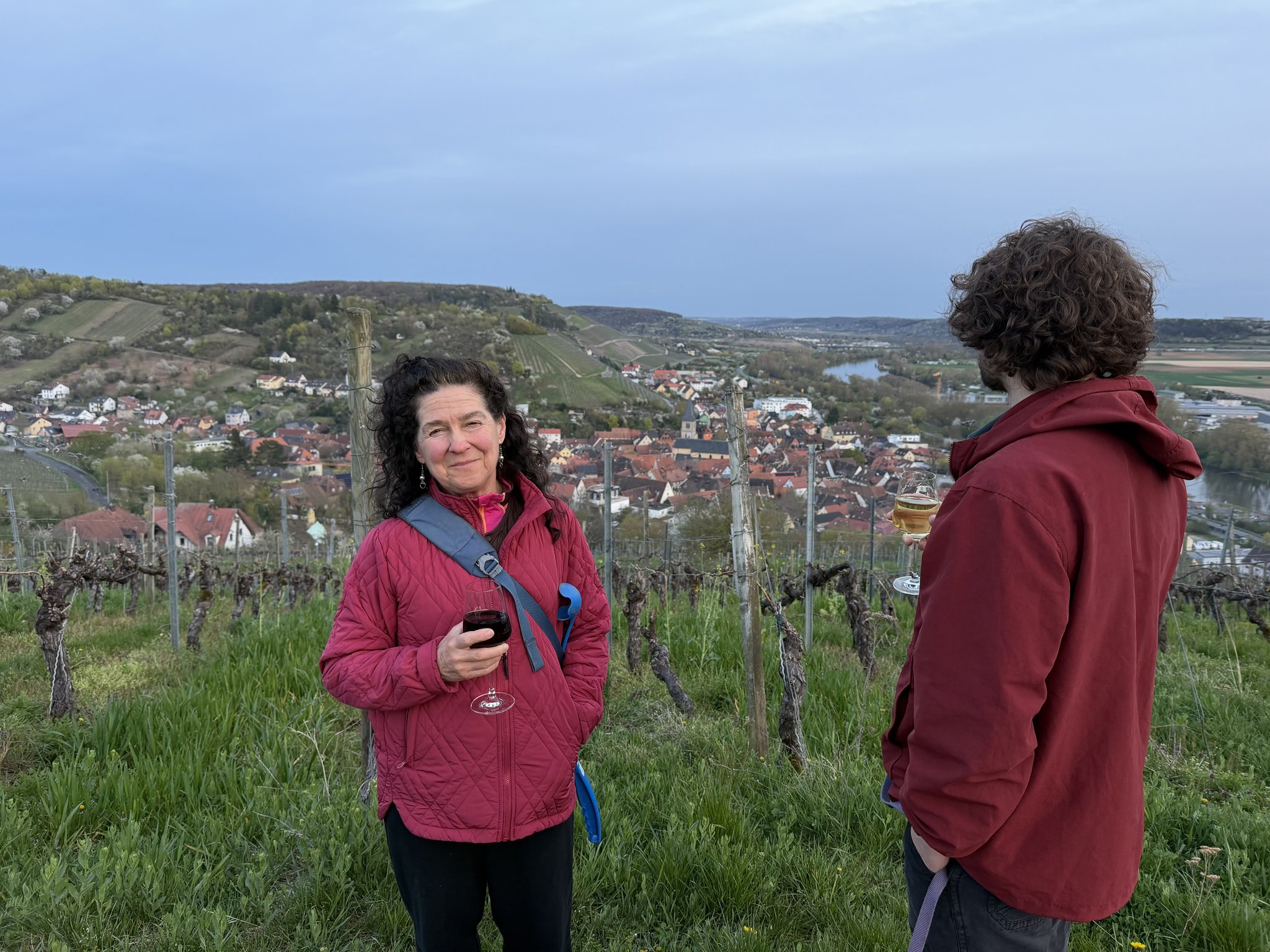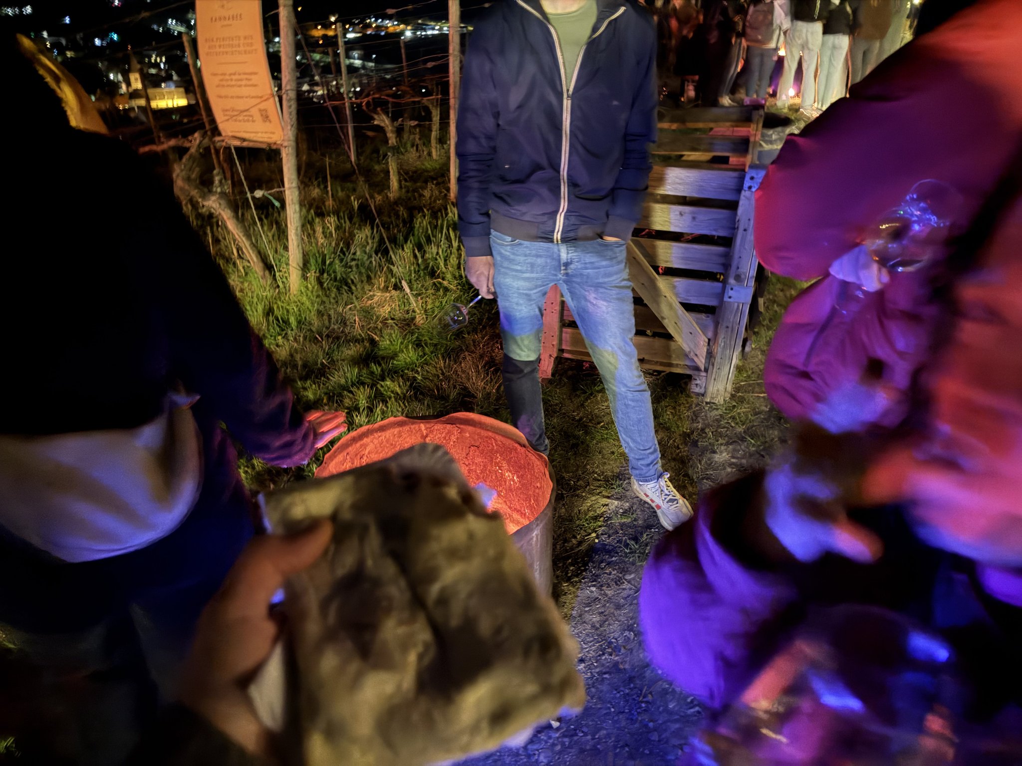 THis evening we hiked over to teh vinyard above Randersaker for the wine festical. .It was quite a scene.. Lots (mabey 100 ? ) of people there drinkign local wine from this year, eating various parts of animals.. and making flamekuchne (kind of a local type of Pizza).. there were fire barrells everywhere that kept us all warm.. then hiked back in the dark.. so very fun !!!