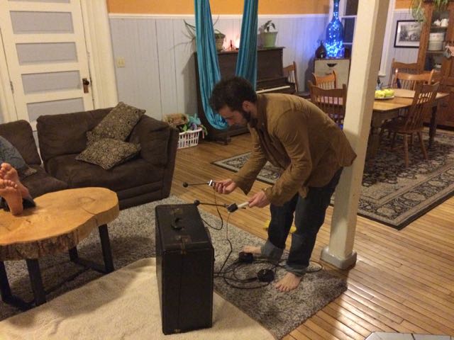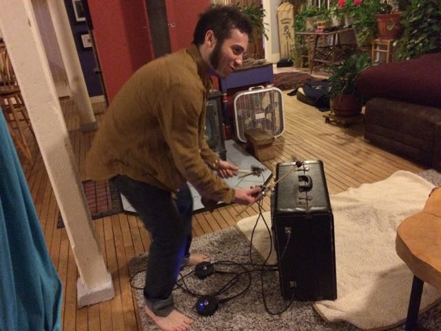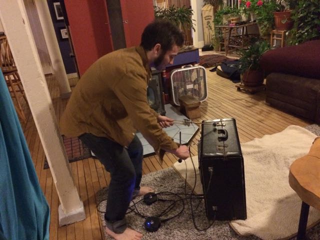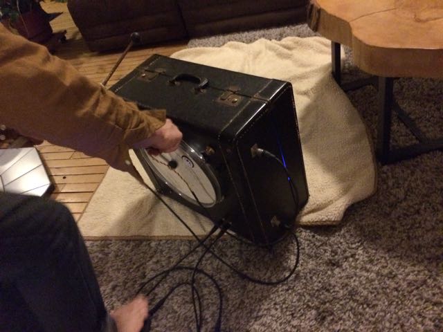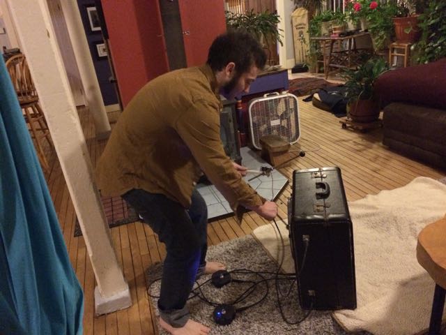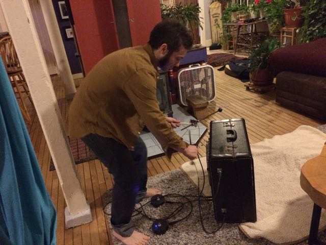 after dinner, final tests on the drum-bot that max is building. I’m helping with the code. He’s done a great job on this. The idea is to build a simple suitcase that someone can turn into a drumming robot in a subway station. He’s building it for an acoridian playing friend of his. It works great now. all he needs to do is to attach the sib and then mouth the servo arms..