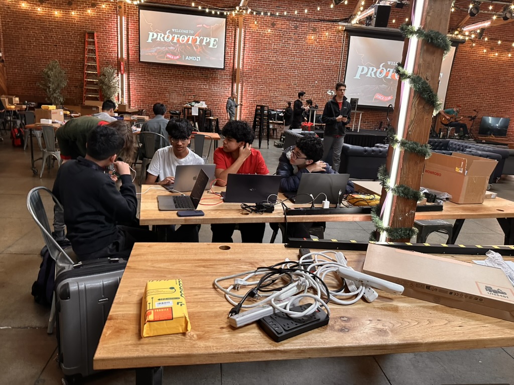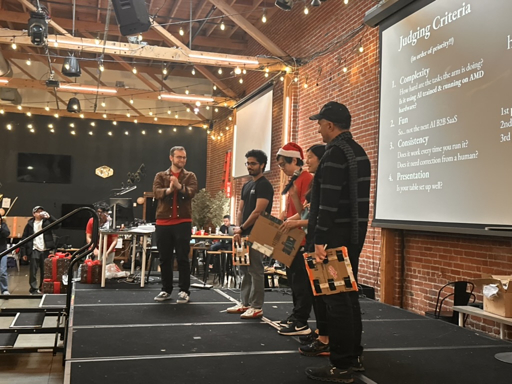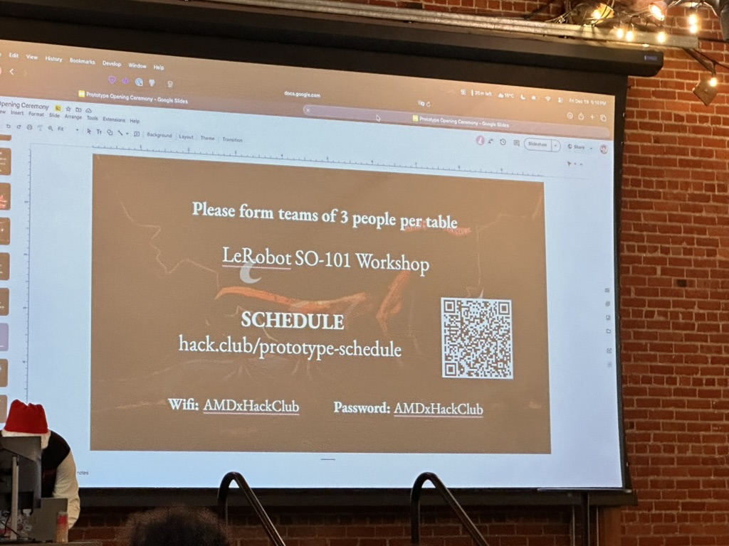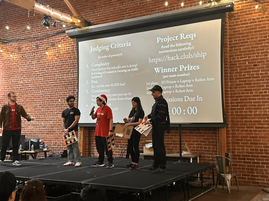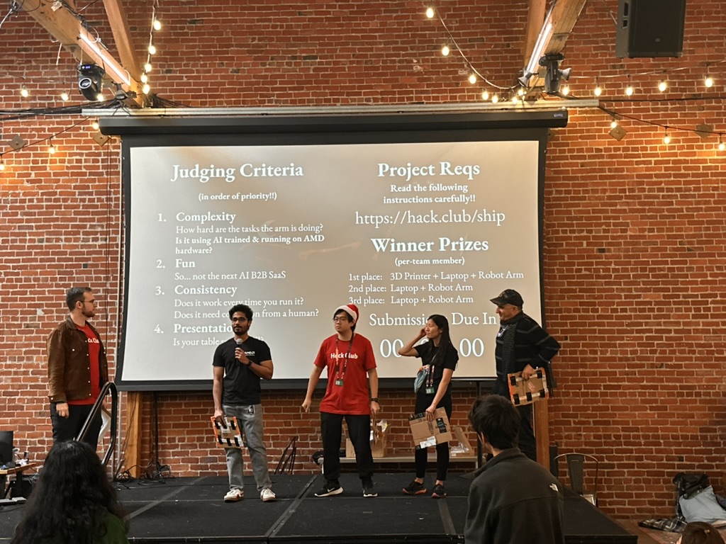 Then came the time for the projects to be judged.. the judging criterion were reviewed again. then a team of judges from AMD and Hackclub began visiting all the teams. Teherewere some amazing projects that all hilighted the DELL AI laptops with AMD Processors and Radeon GPUS as well as a the Open Source LeRobot robotic arm platform.