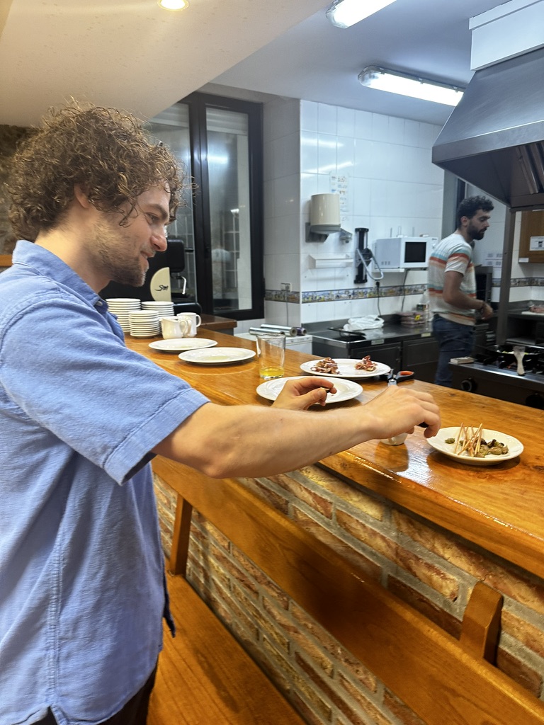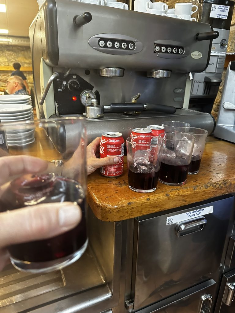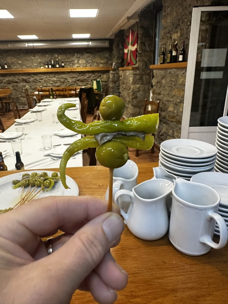 This was our first introduction to this basque fast food Pintxos.. (prounonced ‘pinho’) .. It’s like a mix of tapas and sushi. Small bites usually on a piece of bread with all sorts of fish meat. You name it. You go up to a counter and point to a bunch of things and you have a full meal with amazing variety and about 10 seconds. One thing that I was surprised by but enjoyed is how vital of the Basque language is. I had somehow in my mind that the language was only spoken by older people in remote villages, but thanks to the Basque nationalist movement Basque was taught in all schools as a primary language. All signs were in Basque and in Spanish… And most advertisements were in both or only in Basque. One interesting side effect is that all the young people here speak Basque while their parents do not.