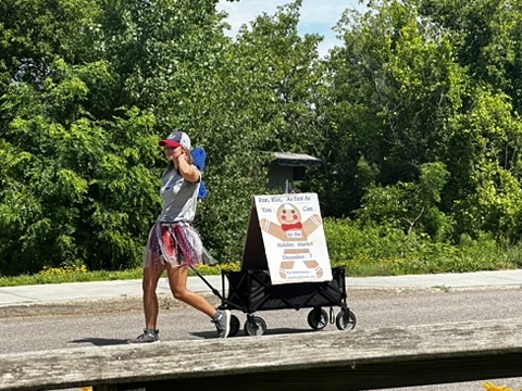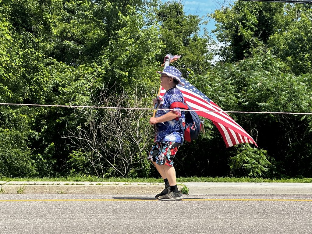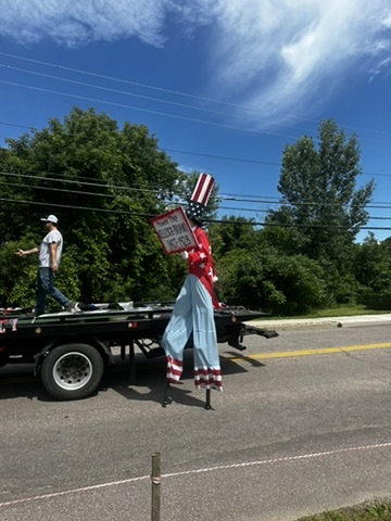 Our friend Marshall always stilt walks at the end of the parade. He always carries a sign.. and we always have to look up what it means