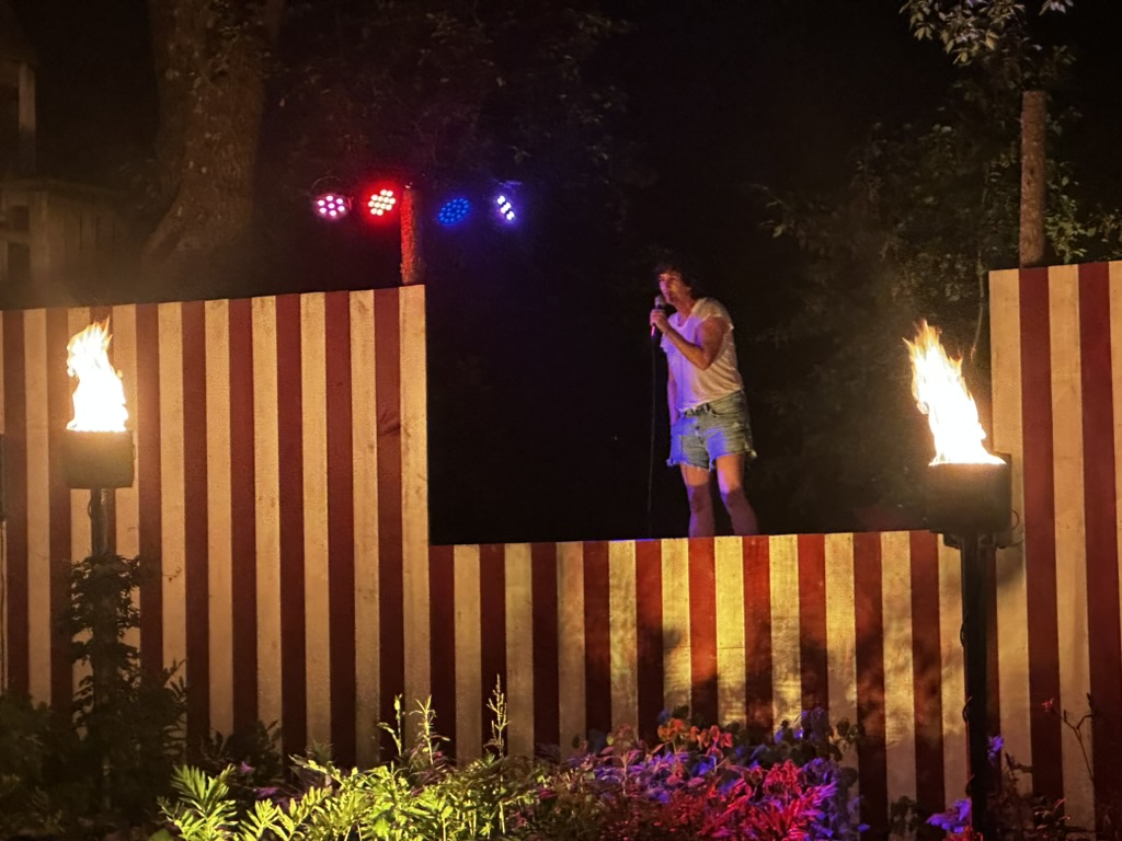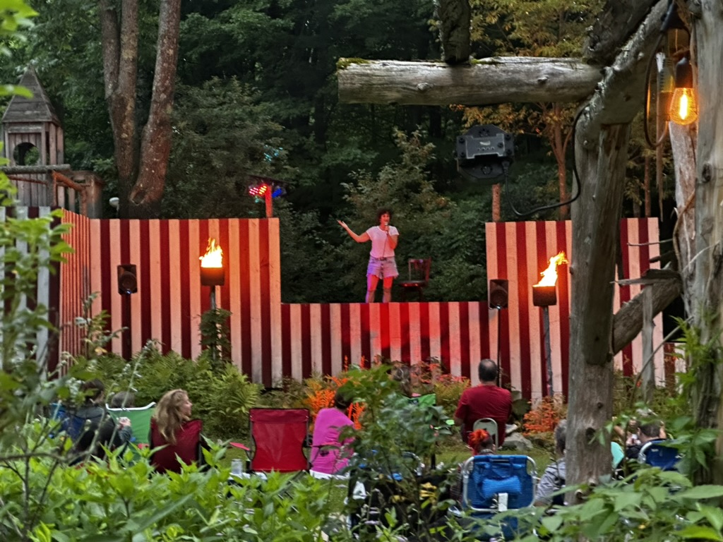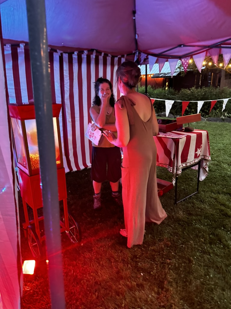 Later that evening we went to Chris and Kims to see a comedy show on their ackyard stage. DIane and I served pop corn and snow cones..