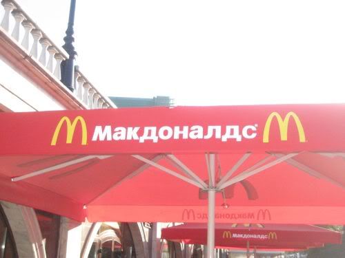 So.. where was I ? (There’s always that akward transistion) Yesterday.. I mentioned I started with a 6:30 AM run around the Kremlin. It was so cool being out on the street in braod daylight with hardly another soul in sight. Folks seem to get to work here around 10 AM.. that’s because they eat dinner around 10PM.Here are some pictures from yesterday’s run.. Note that Ameikansky culture is all around..