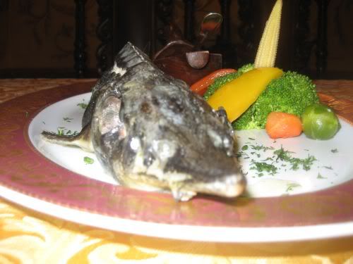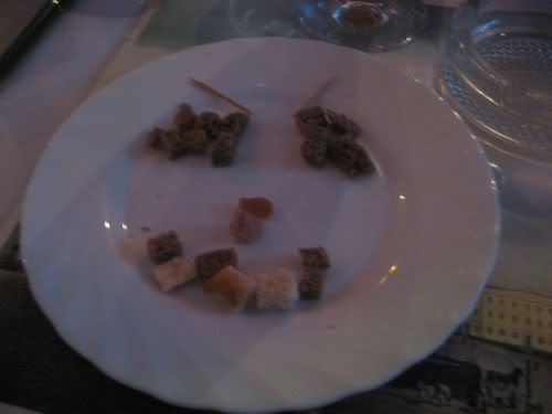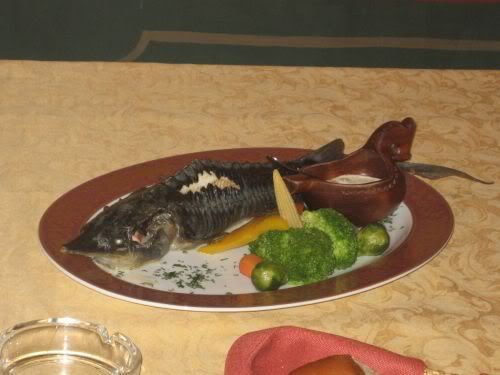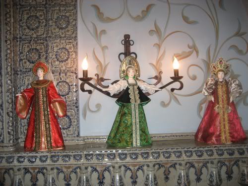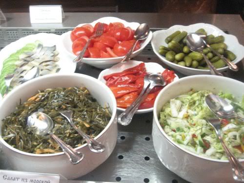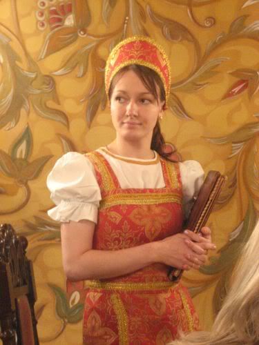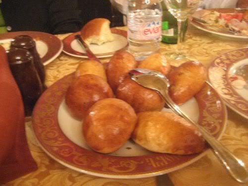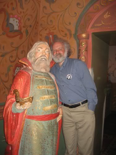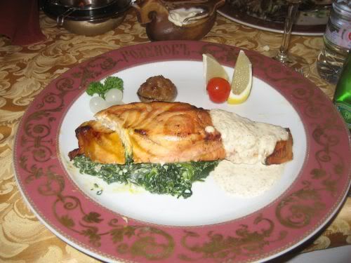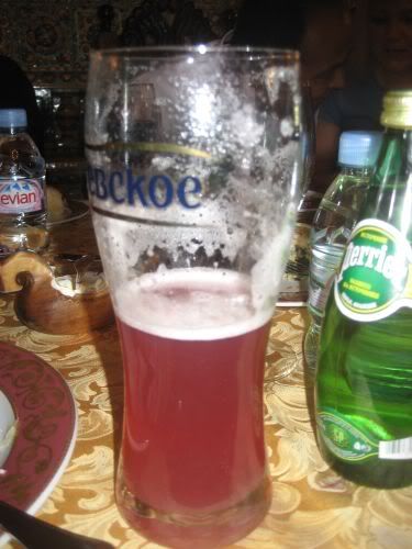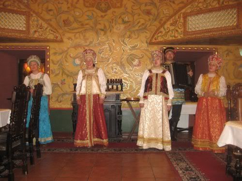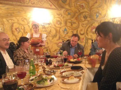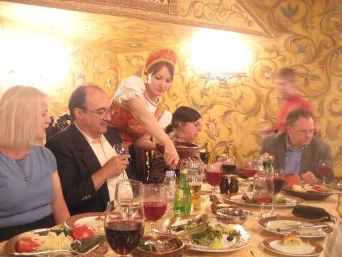 Around 6 we headed back to the hotel. Last night was our big communal dinner . We went to a traditional Moscow place and it was fantastic.. The place was all decorated with mosaics and murals. The staff were all in native costumes. I could tell that the place was geared to tourists.. but it felt real. They kept bringing cool food out.. and we kept eating. The food was amazing !