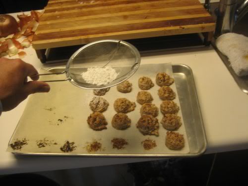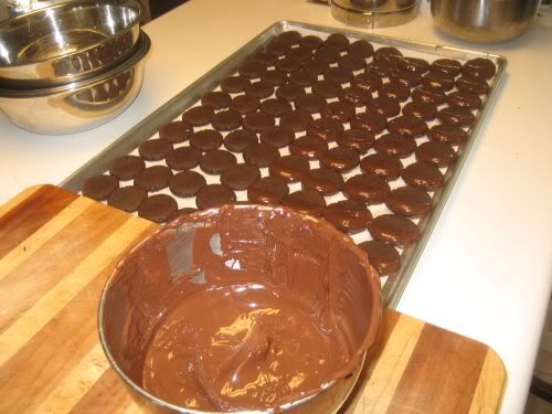 I was starting to spin on that when Diane called to tell me that our friend Arthur …was desperately in need of extra kitchen help. Arthur, who’s a professional cook..and his family had very graciously offered to volunteer their cooking and serving to the Voices movie fundraiser He was cooking for 175 folksand it required more than his two capable hands. Diane and I showed up to do whatever we could. It was a great experience. I ended up dipping several hundred chocolate cookies in chocolate, dusting a bunch of almond meringues with sugar , making Crème Fraise from scratch, and helping make some really cool Portobelloquiches. In addition I washed a veritable mountain of dishes.It was fun to help