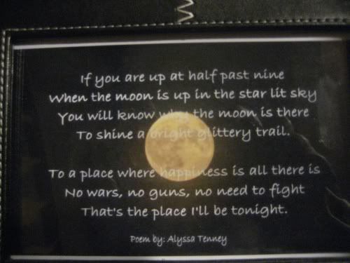 Several months ago Jeannie gave us a very cool picture she call’s Ila’s Moon. It’s a beautiful picture of the full moon .. which was very special to Ila’s life. On the picture is a poem that a friend ‘s daughter, Alyssa, had written for her.