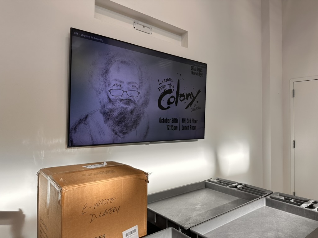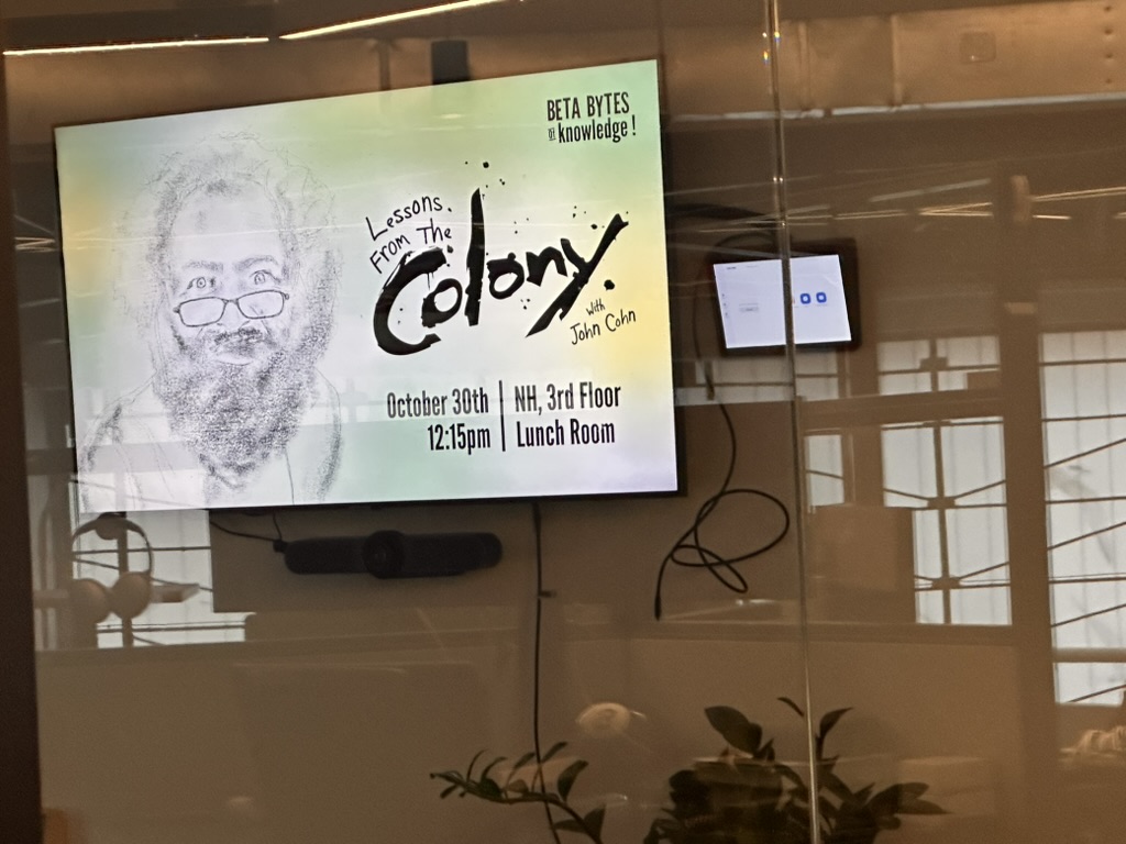 This Thursday i’m giving a BETA Bytes of Knowledge (BBOK) talk about the Colony . I’m very excited and kind of nervous.. My face is all over the company . which is very weird.