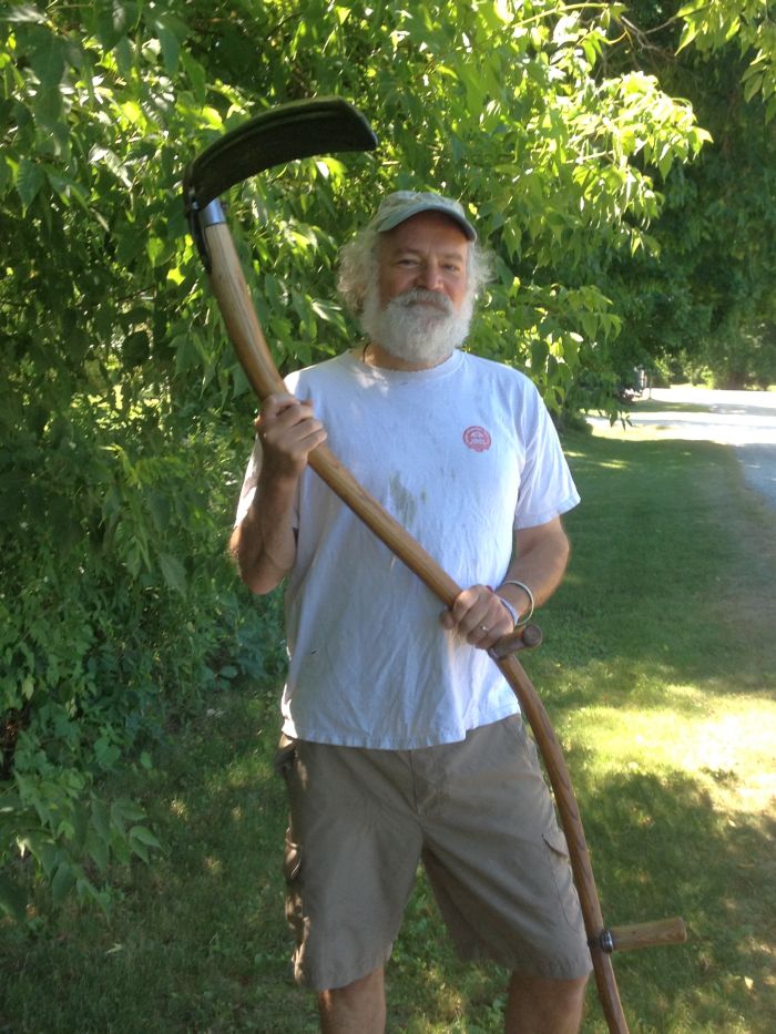 i woke up realizing that I had nothing at all planned for the day.. always a rare pleasure. I decided that I’d spend the day doing some trail maintenance on the Rivershore trail we run on most days. The foliage is getting high and it’s a pain to run to in the mornings when it’s wet. John H. down the street had offered us his scythe .. so after breakfast.. Diane , and I took the girls and headed down the trail…Â Â Here’s me as the not so grim reaper…